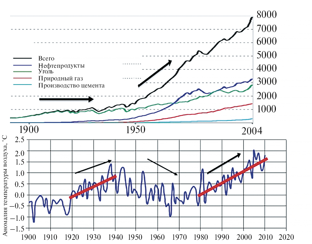 Другие сомнения в справедливости антропогенной концепции возникают при сопоставлении временного хода изменения средней температуры и объемов выброса углекислого газа в современную эпоху в ХХ и ХХI вв. Исходя из этой концепции, естественно было бы ожидать, что должна наблюдаться прямая корреляция между объемами выбросов углекислого газа и изменениями температуры среды. Однако, как видно на рис. 3, имеет место фактически антикорреляция этих параметров для центральной части графика за период с 1940 по 1975 г. На нем показаны фазы потепления и похолодания климата в XX–XXI вв. в сравнении с изменениями объемов промышленных выбросов СО2 в атмосферу. В частности, периоду 1945–1975 г. наиболее быстрого увеличения объемов выбросов СО2 отвечает период относительного похолодания Земли, что находится в явном противоречии с антропогенной концепцией. Далее, начавшемуся резкому потеплению климата в районе 1980 г. соответствует локальный спад выбросов. Наконец, периоду подъема температуры 1920–1938 г. отвечает примерно одинаковый уровень выбросов СО2. Показанное на рис. 3 отсутствие ожидаемой хотя бы качественной корреляции между средней температурой и объемами промышленных выбросов СО2 на существенных отрезках временной шкалы вряд ли может свидетельствовать в пользу антропогенной концепции потепления климата.