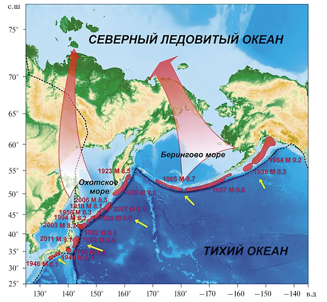 Этот сдвиг связан с временем пробега деформационных волн от зон субдукции до Арктической зоны с характерной скоростью порядка 100 км/год. На рис. 5 показаны очаги серии сильнейших землетрясений в Алеутской и Курило-Камчатской островных дугах и условные траектории движения деформационных волн в сторону Арктики.