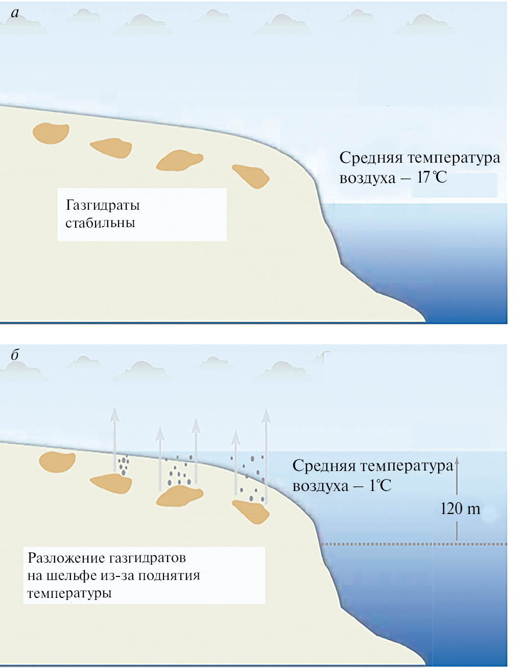 Рис. 6. Влияние изменения уровня моря на стабильность арктических газгидратов: a – холодный период, уровень моря понижен, дно мелководного арктического шельфа выходит на поверхность, среднегодовая температура –17 °C; б – теплый период, уровень моря повышен, шельф затоплен, среднегодовая температура воды –1°C [17].