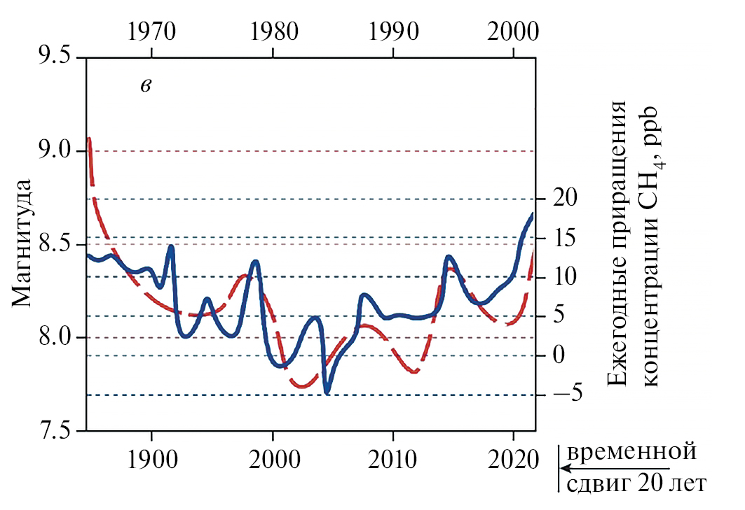 Исходя из сейсмогенно-триггерной гипотезы, следовало бы ожидать, что изменения темпа роста концентрации этого газа в атмосфере должны коррелировать с изменениями уровня выделения сейсмической энергии Земли (с учетом временного сдвига порядка 20 лет, связанного с временем пробега деформационных волн от очагов больших землетрясений до мест скопления метана, запертого в осадочных породах прежде всего Арктической зоны). Такую корреляцию иллюстрирует рис. 8: две огибающие кривые отражают изменение среднегодовых приращений концентрации метана в атмосфере в период 1984–2022 гг. и вариации уровня сейсмической активности Земли, определяемой сильнейшими землетрясениями с магнитудой больше 8 за период 1964–2002 гг. (с учетом упоминавшегося временного сдвига). Корреляционное подобие двух кривых, на наш взгляд, свидетельствует в пользу рассматриваемой нами гипотезы потепления климата.