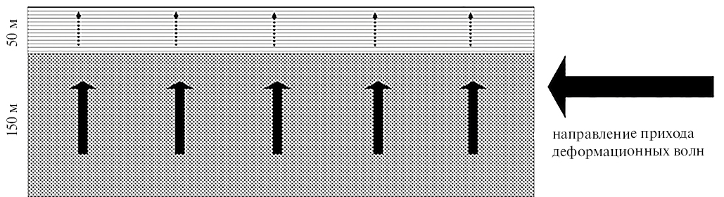 Рис. 9. Вертикальная фильтрация метана, вызванная триггерным эффектом деформационных волн (жирные сплошные стрелки), поднятие пузырьков метана в воде – сипы (прерывистые стрелки).
