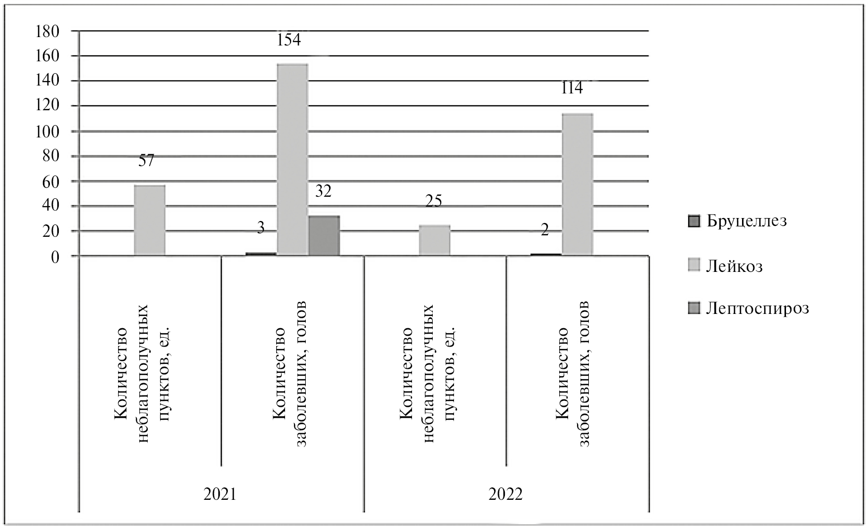 В 2022 г. (в сравнении с 2021 г.) уменьшилось количество инфицированного вирусом лейкоза крупного рогатого скота и количество неблагополучных пунктов.