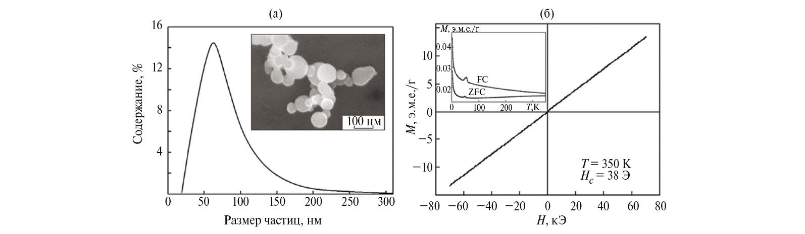 Полученные при нагревании в магнитном поле (FC) и без поля (ZFC) температурные зависимости намагниченности имели вид, типичный для суперпарамагнетиков (вставка на рис. 5, б). По характеру кривых можно было бы ожидать их пересечения при температурах выше 350 K. Резкое увеличение значения намагниченности в области низких температур объясняется присутствием парамагнитных примесей в покрытии или влиянием TiO2/Ti.