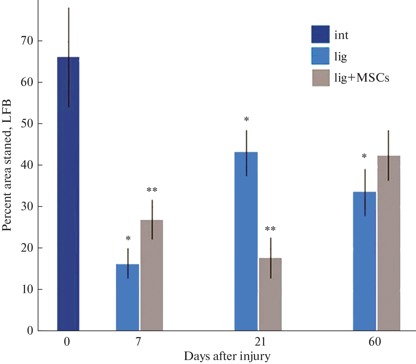Изучена динамика изменений процессов валлеровской дегенерации в седалищном нерве крыс Вистар-Киото после травмы (наложения лигатуры, 40 с): исследованы плотность Iba-1+ макрофагов и состояние миелиновых волокон, окрашенных люксолевым прочным синим, в дистальном сегменте нерва в разные сроки после повреждения. Части крыс субпериневрально трансплантировали мезенхимные стволовые клетки костного мозга крыс той же линии. Показано, что наибольшая плотность распределения макрофагов в дистальном сегменте нерва наблюдается через 7 сут после операции. Применение клеточной терапии приводит к снижению числа макрофагов в этот срок и к задержке демиелинизации поврежденных нервных волокон. Через 60 сут после операции плотность популяции макрофагов и количество ремиелинизированных регенерирующих нервных волокон дистального сегмента нерва не отличается у контрольных (лигатура) и подопытных (лигатура и введение мезенхимных стволовых клеток) животных. Молекулярные механизмы отмеченных изменений в ранние сроки после повреждения требуют дальнейших исследований.