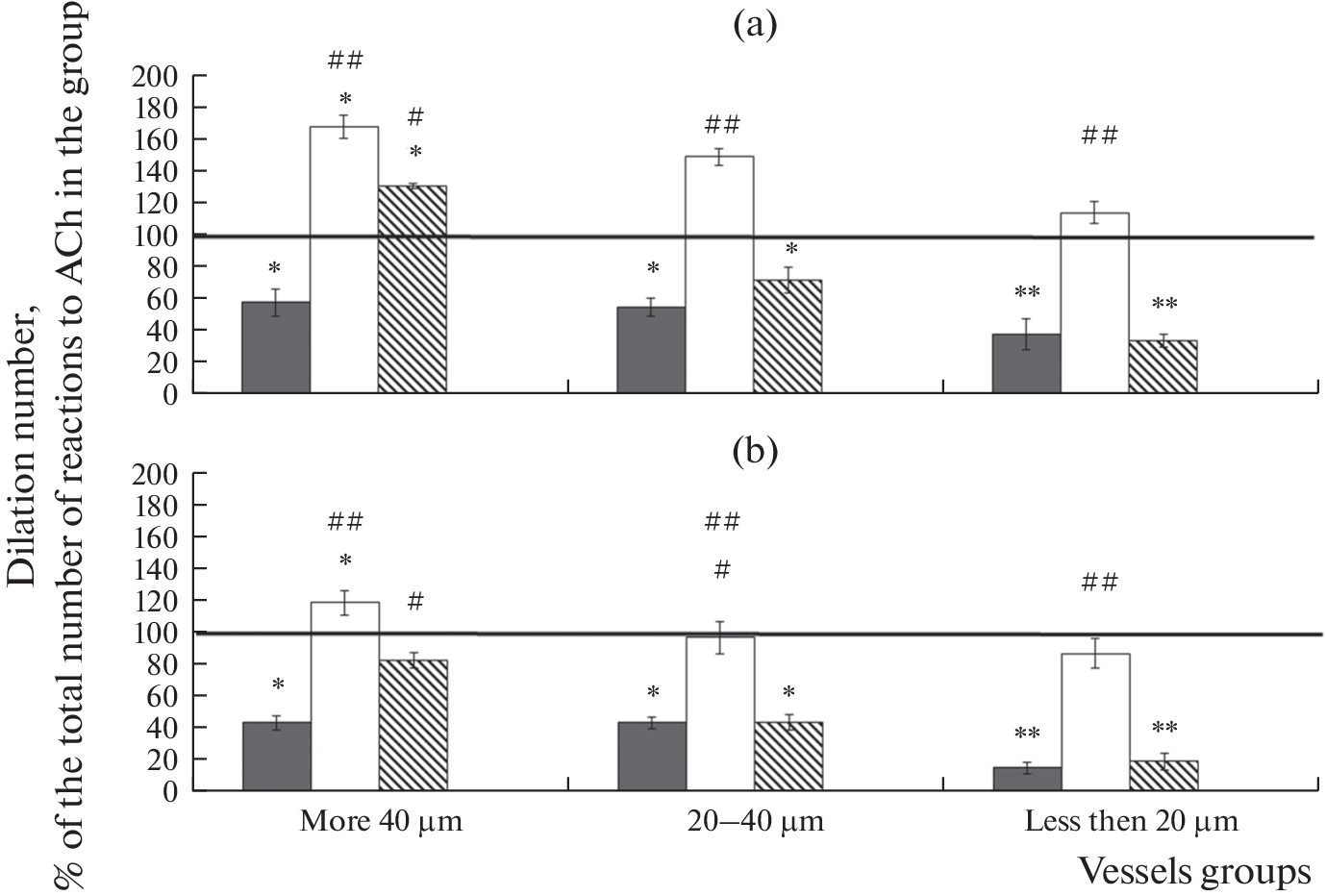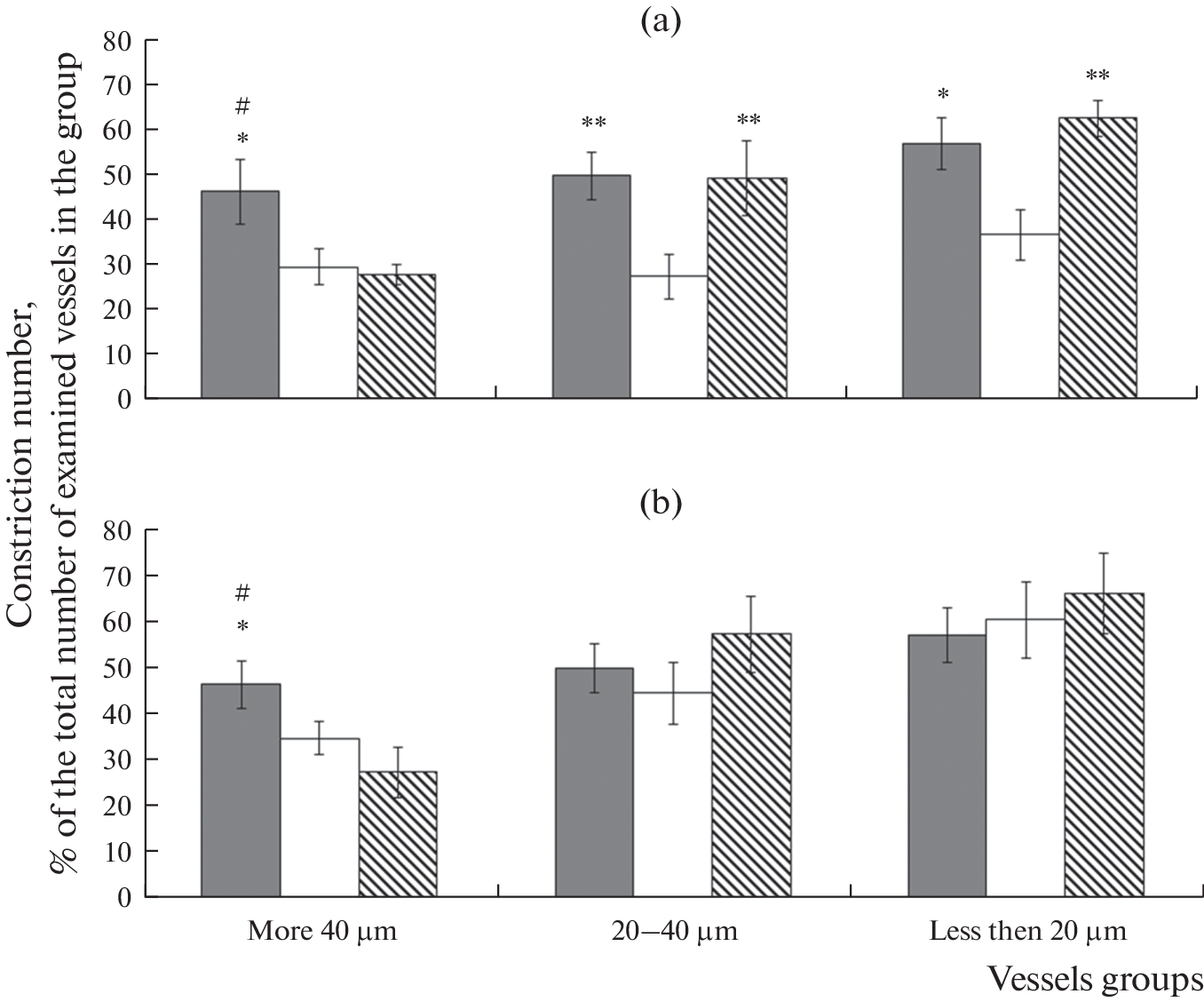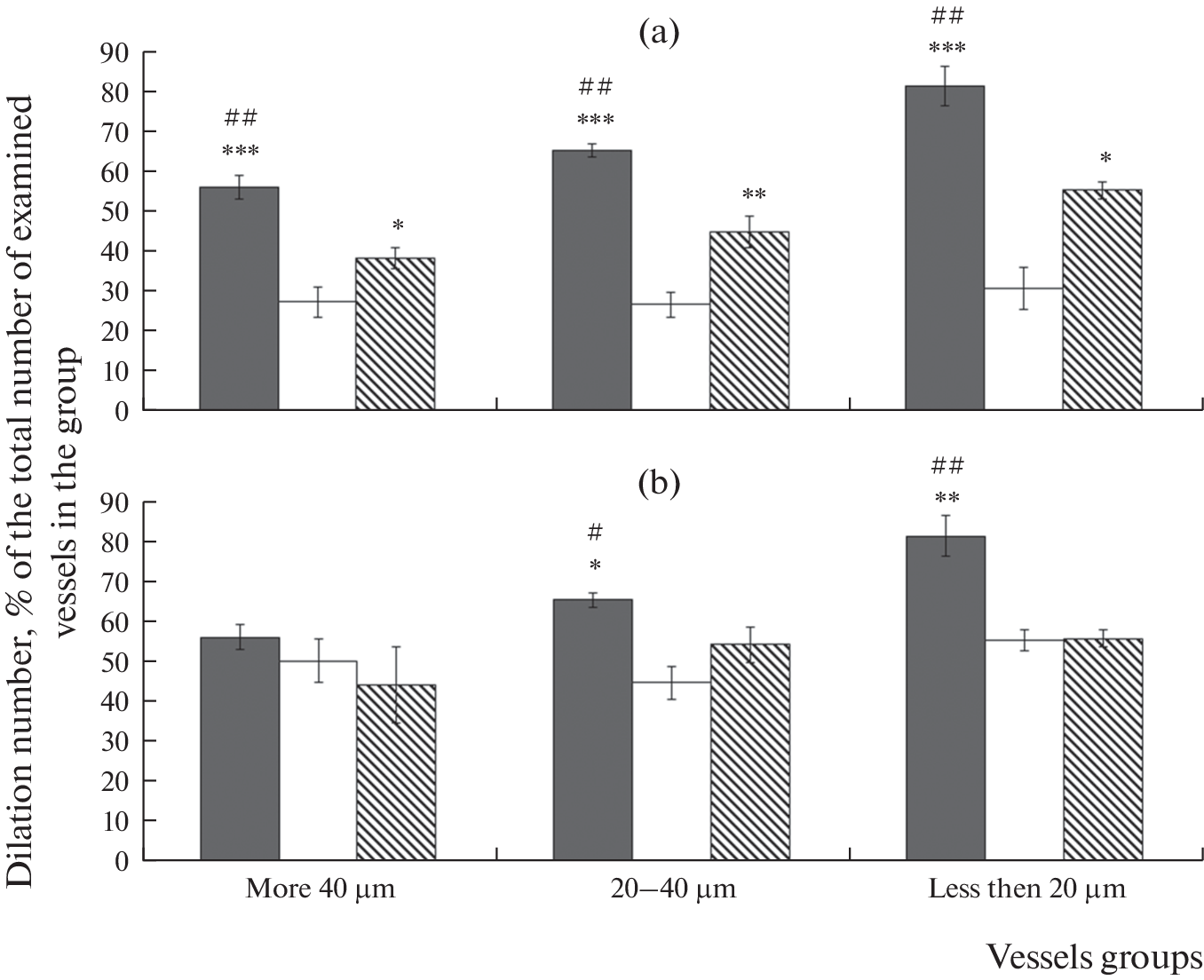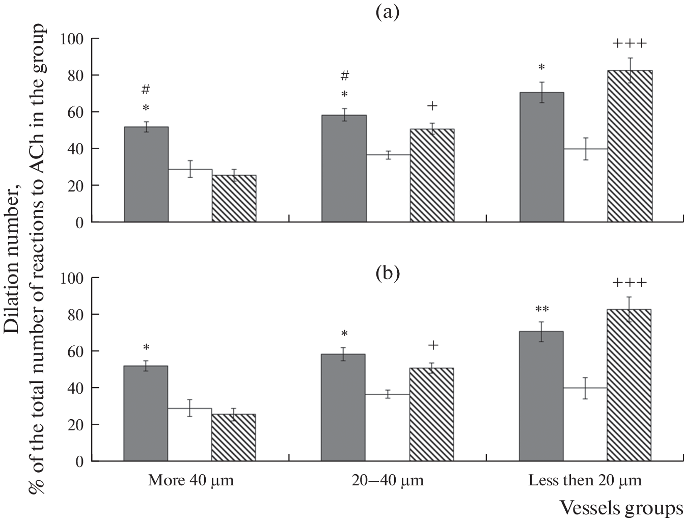 This study aims to examine the efficiency of intravenous transplantation of human mesenchymal stem cells (hMSCs) performed 7 days after cerebral ischemia/reperfusion (I/R) for recovery of the functional activity of KATP-channels of cerebral arteries. Using a device for intravital visualization of pial vessels, the reaction of arteries to the KATP-channel blocker glibenclamide (GB), the activator of the same channels of pinacidil (PI), acetylcholine (ACh), and ACh against a background of GB action (ACh/GB) 14 and 21 days after I/R and intravenous hMSC transplantation performed 7 days after ischemic exposure. On exposure to GB 14 days after I/R, 1.5–1.8 times fewer arteries narrowed than in the sham–operated (SO) rats. By day 21 after I/R, the constriction reaction was completely restored, except for arteries with a diameter more 40 μm. In the cell–therapy group, the constrictor response to GB was completely recovered to the level of SO animals in arteries with a diameter less than 40 μm by 14 day after I/R exposure; in arteries with a diameter of more than 40 μm, the constriction reaction did not recover until 21 days. The number of dilations per ACh/GB compared to a clear ACh in SO rats was reduced in 1.6–1.8 times on 14 day after I/R and in 1.6–6.6 after 21 days. In I/R animals on 14 day, the number of dilatations per ACh/GB compared to clear ACh was significantly increased in arteries with a diameter of more than 20 μm by 1.5–1.7 times, and after 21 days in arteries with a diameter of more than 40 μm by 1.2 times. After the introduction of hMSC, GB blocked ACh–mediated dilation in arteries less than 40 μm in diameter both on days 14 and 21 after I/R. In arteries with a diameter of more than 40 μm the functional activity of KATP-channels did not recover until 21 days. Conclusion. I/R of the rat cerebral cortex reduces the contribution of KATP-channels to maintaining the basal tone of the pial arteries and almost completely excludes these channels from the formation of ACh–mediated dilation during 21 days of the postischemic period. Practically did not participate in the dilatory response. Intravenous transplantation of hMSC, performed 7 days after I/R, results in restoration of participation of SMC KATP-channels in maintaining the basal tone and ACh–mediated dilatation of pial arteries with a diameter less than 40 μm already 14 days after I/R.