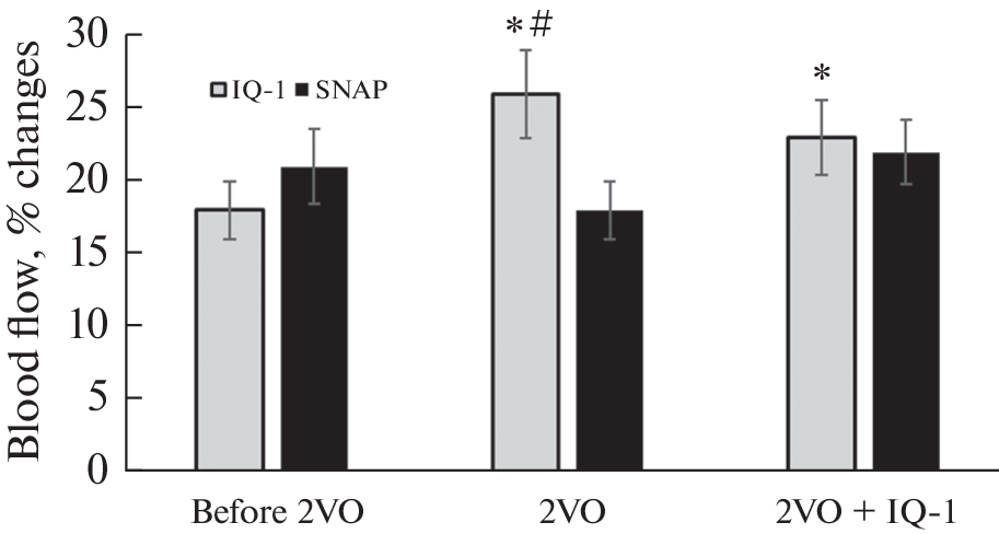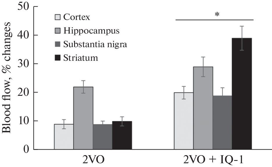 Целью работы явилось изучение вазоактивного и нейропротекторного действия ингибитора с-Jun-N-терминальных киназ (JNK), IQ-1 (11H-индено[1,2-b]хиноксалин-11-он оксим) при хронической гипоперфузии головного мозга, вызванной невозвратной билатеральной перевязкой сонных артерий. Мозговой кровоток измерялся количественно (метод клиренса водорода) одновременно в теменной коре, гиппокампе, черной субстанции и стриатуме головного мозга бодрствующих крыс. Перевязка сонных артерий вызывала понижение кровотока в исследуемых мозговых структурах с более выраженным снижением в коре (на 48% от исходного уровня) и с наименьшим падением в черной субстанции (на 25% от исходного уровня). Пониженный уровень кровотока в этих мозговых структурах сохранялся на протяжении 14 дней измерений. Реакции мозговых сосудов на гиперкапнический стимул (5% СО2) утрачивались в период 2-недельной гипоперфузии, а неврологический статус животных не улучшался. Введение препарата IQ-1 (50 мг/кг, интраперитонеально, каждые 48 ч в течение 14 сут) сопровождалось увеличением кровотока во всех структурах мозга. Максимальное увеличение кровотока наблюдалось в стриатуме, а минимальное – в черной субстанции. После введения IQ-1 восстанавливалась чувствительность мозговых сосудов к гиперкапническому стимулу и существенно улучшалось неврологическое состояние животных к концу 2-й нед. гипоперфузии головного мозга. Результаты показывают, что использование ингибитора JNK позволяют уменьшить цереброваскулярные нарушения и связанные с ними неврологические расстройства при гипоперфузионном повреждении головного мозга.
