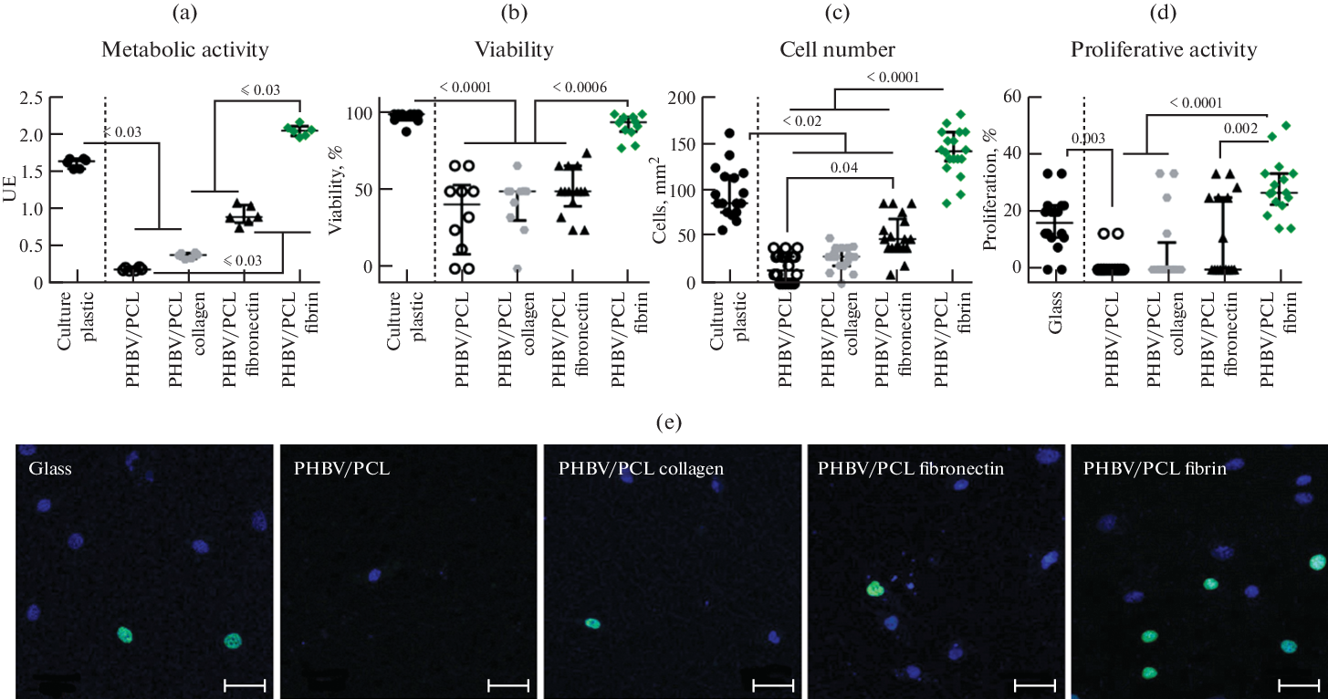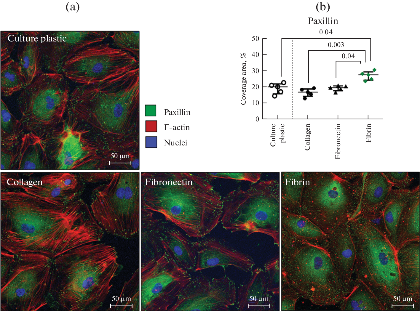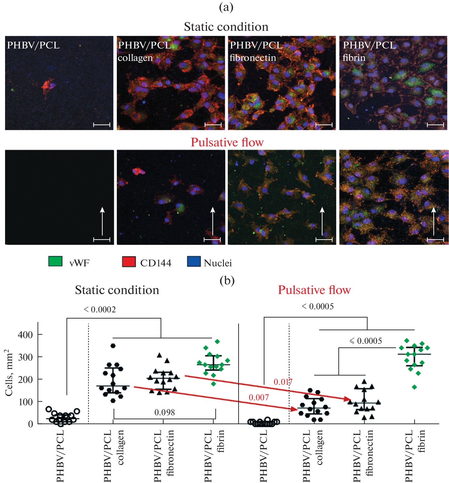 Разработки протезов сосудов малого диаметра показали, что модифицирующее покрытие, сохраняющее эндотелиальный слой в условиях пульсирующего потока, препятствует тромбообразованию и определяет исход имплантации. Для улучшения адгезии эндотелиальных клеток в качестве покрытия используют различные белки внеклеточного матрикса (коллаген, фибронектин, фибрин), которые требуют сравнения. Цель работы заключалась в поиске наиболее эффективного покрытия белками внеклеточного матрикса, поддерживающего биологическую функциональность и сохраняющего эндотелиальный слой в условиях пульсирующего потока. Методы исследования: матрицы и графты изготавливали из поли(3-гидроксибутирата-ко-3-гидроксивалерата) и поли(ε-капролактонона) методом электроспиннинга, модифицировали коллагеном 1-го типа, фибронектином и фибрином. Образцы заселяли культурой колониеформирующих эндотелиальных клеток (КФЭК). Выполнено два блока исследований: в статике и в динамике. В статических условиях, после 3 дней инкубации КФЭК на поверхности образцов, изучали их биологические характеристики: жизнеспособность, метаболическую и пролиферативную активность клеток, адгезионные свойства по площади, занимаемой белком фокальной адгезии паксиллином. Удержание клеток оценивали сравнением плотности клеток на внутренней поверхности сосудистых графтов диаметром 4 мм в условиях пульсирующего потока и в статике через 7 суток инкубации. Было найдено, что в статических условиях метаболическая активность, жизнеспособность, количество и пролиферативная активность КФЭК, а также площадь, занимаемая белком фокальной адгезии паксиллином, на матрицах, покрытых фибрином, были выше, чем на коллагене и фибронектине. Плотность КФЭК (кл/мм2) на внутренней поверхности графтов с фибриновым покрытием не различалась в статических и динамических условиях. На образцах с коллагеном и фибронектином в условиях пульсирующего потока плотность клеток была в 2 раза меньше, чем при статической инкубации. Заключение. Фибрин продемонстрировал высокую биологическую активность, адгезионные свойства и сохранение эндотелиального слоя в статике и в условиях пульсирующего потока по сравнению с коллагеном и фибронектином. Покрытие фибрином является вариантом выбора при модифицировании внутренней поверхности сосудистых протезов.