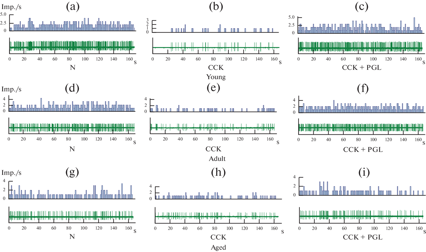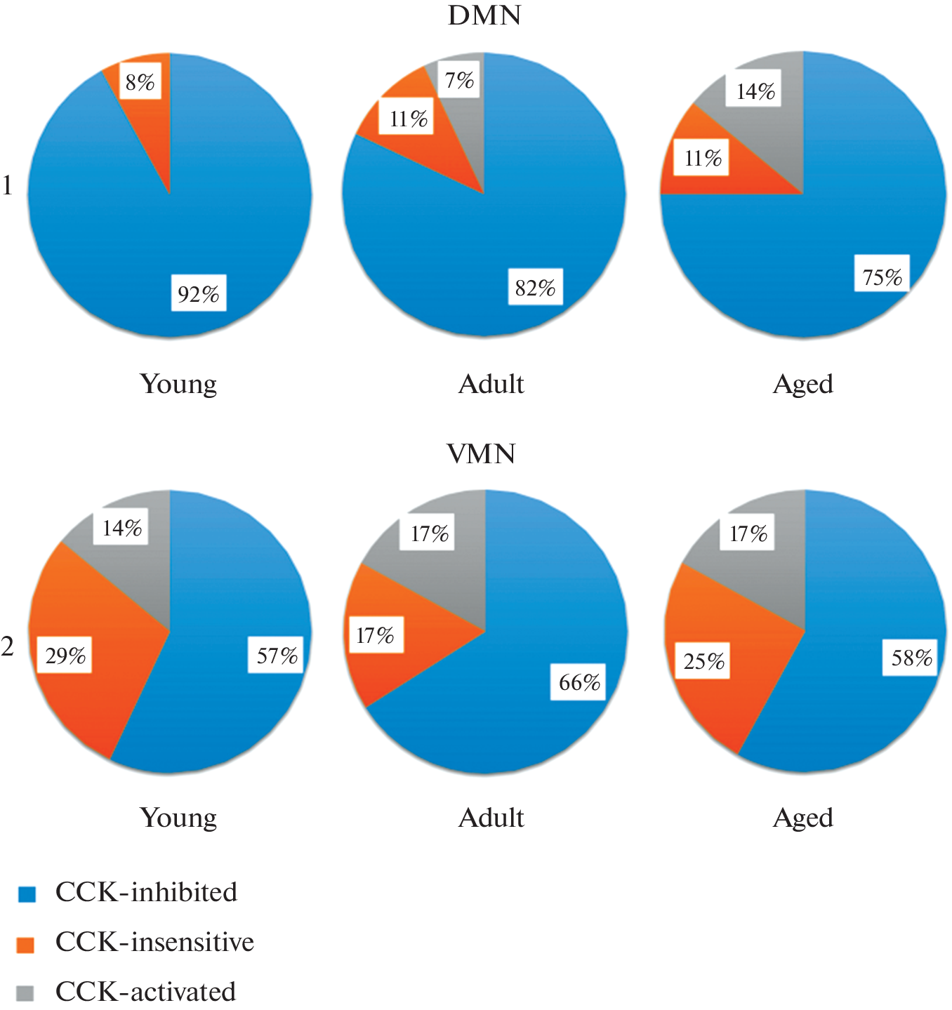Целью работы являлcя анализ фоновой и вызванной внутривенным введением сульфатированного октапептида холецистокинина (CCK), а также антагониста холецистокинина проглумида импульсной нейронной электрической активности в дорсомедиальном (ДМЯ) и вентромедиальном (ВМЯ) ядрах гипоталамуса у самцов молодых (2–3 мес.), взрослых (12 мес.) и старых (24 мес.) крыс под уретановым наркозом. Средняя частота фоновой импульсации нейронов при внутривенном введении CCK у молодых крыс в ДМЯ достоверно снижалась с 1.5 ± 0.4 до 0.2 ± 0.1 имп./с, в ВМЯ – с 2.0 ± 0.4 до 0.9 ± 0.2 имп./с. Одновременное введение CCK и проглумида не приводило к изменению характера нейронной активности в данной возрастной группе. У взрослых и старых крыс средняя фоновая частота разрядов нейронов ДМЯ и ВМЯ была ниже в сравнении с молодыми крысами и под влиянием CCK и проглумида достоверно не менялась. В ДМЯ и ВМЯ большая часть нейронов ингибировалась CCK, при этом в ДМЯ процент ингибируемых CCK нейронов был выше по сравнению с ВМЯ. В ДМЯ молодых животных отсутствовали нейроны, активируемые CCK, которые появлялись у взрослых и старых животных.