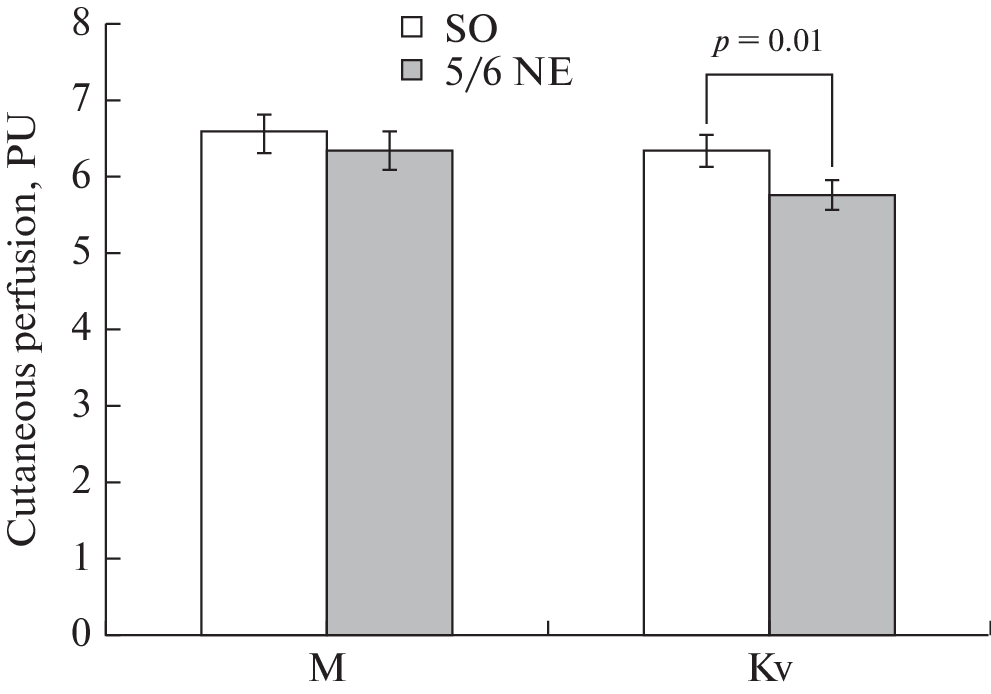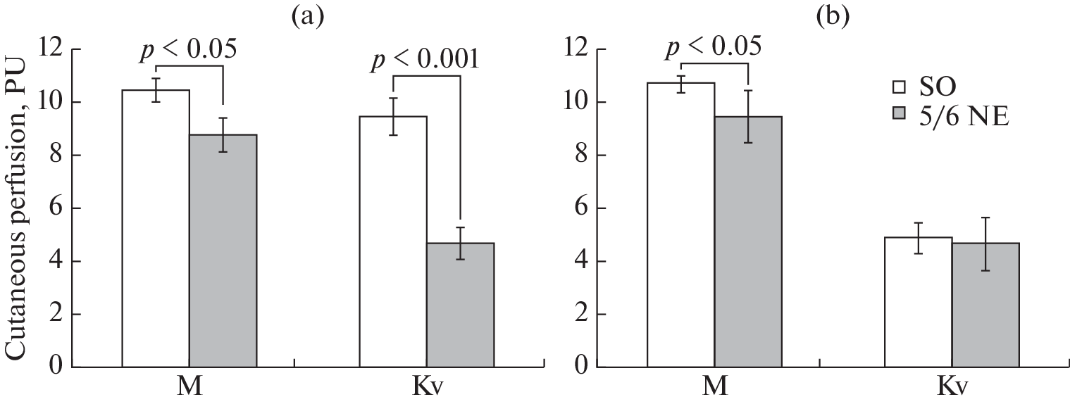Chronic kidney disease is accompanied by cardiovascular complications, including endothelial dysfunction, arterial hypertension, and atherosclerosis. The aim of this work is to compare the reactivity of the vessels of the microcirculatory bed (MCR) of the skin, assessed by laser Doppler flowmetry (LDF) and mesenteric arteries in rats with resection of 5/6 of the mass of the kidneys, and to evaluate the possibility of using LDF analysis as a method that reflects the functional state of large resistive vessels. Wistar rats were divided into two groups: animals of the NE-group (n = 15) had 5/6 of the mass of kidney tissue removed, control animals of the SO-group (n = 15) underwent a sham operation. After 8 weeks, the reactivity of rat skin microvessels to acetylcholine (ACh) and sodium nitroprusside (NP) iontophoresis was assessed. A week later, in rats, the effect of NE on the reactivity of mesenteric arteries preconstricted with phenylephrine was evaluated in vivo using microphotographic and video recording of the diameter. It has been shown that NE does not affect the average value of perfusion in the skin of rats at rest, however, it changes the structure of the frequency range of the spectrum of fluctuations in the MCR index, increasing the value of endothelial, neurogenic, and myogenic tone. NE led to the development of endothelial dysfunction of the mesenteric arteries and MCR vessels of the skin, which was expressed in a decrease in vascular reactivity to the action of endothelium-dependent (ACh) and endothelium-independent (NP) vasodilators. Thus, the development of experimental kidney dysfunction led to changes in the spectral components of fluctuations in the MCR index in the skin, indicating an increase in tonic effects of various genesis on the vessels. NE was accompanied by a decrease in the reactivity of microvessels of the skin and mesenteric arteries, however, there was no correlation between an increase in the MCR index and dilatation of the mesenteric arteries under the action of vasodilator agonists.
