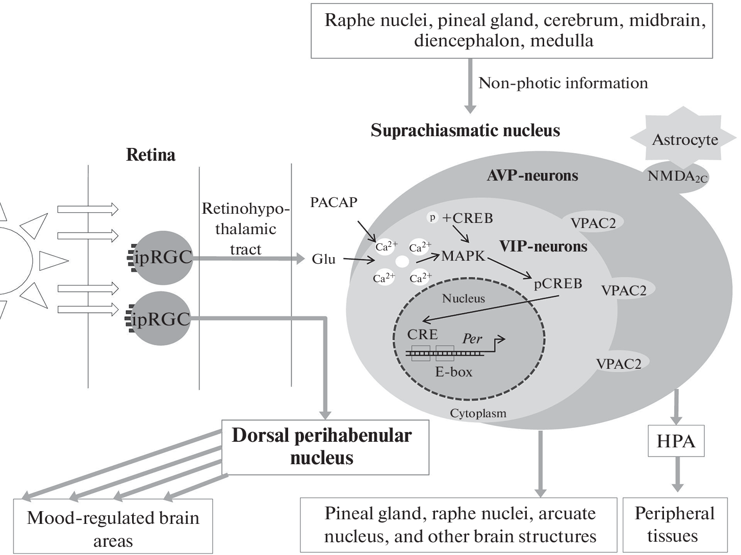- Lindberg PT, Mitchell JW, Burgoon PW, Beaulé C, Weihe E, Schäfer MK-H, Eiden LE, Jiang SZ, Gillette MU (2019) Pituitary Adenylate Cyclase-Activating Peptide (PACAP)-Glutamate Co-transmission Drives Circadian Phase-Advancing Responses to Intrinsically Photosensitive Retinal Ganglion Cell Projections by Suprachiasmatic Nucleus. Front Neurosci 13: 1281. https://doi.org/10.3389/fnins.2019.01281