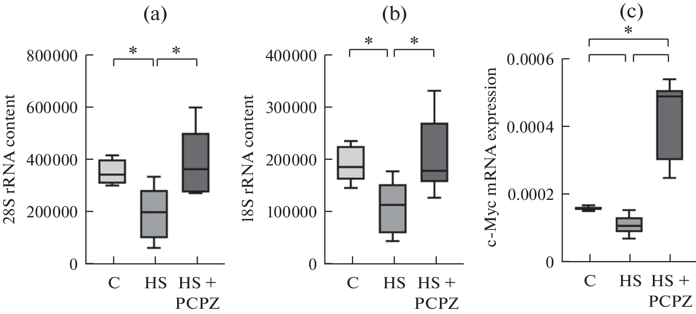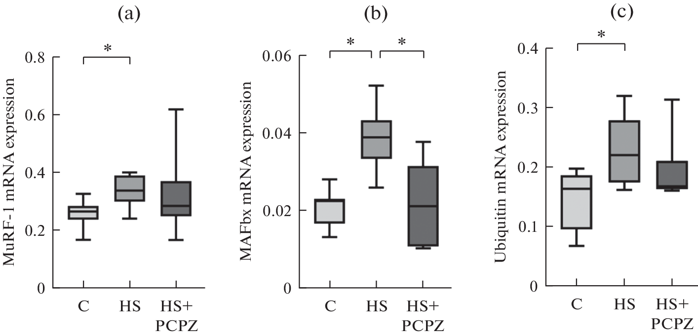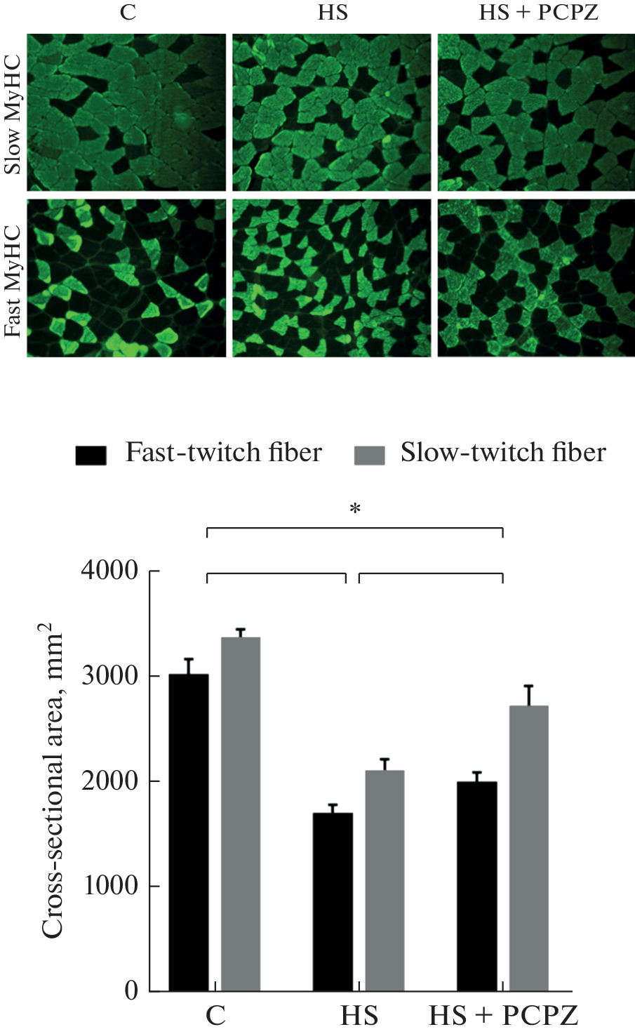 Хорошо известно, что бездействие скелетных мышц млекопитающих приводит к прекращению их электрической активности и сопровождается атрофическими изменениями мышечных волокон. Однако неоднократно отмечалось, что начиная с 3-х суток функциональной разгрузки появляется спонтанная ритмическая нервно-мышечная активность, являющаяся результатом снижения экспрессии калий-хлоридного котранспортера KCC-2 в нейронах поясничного отдела спинного мозга. Снижение экспрессии KCC-2 и возникновение автономной электрической активности мышцы в условиях разгрузки может быть предотвращено введением нейролептика прохлорперазина. Таким образом, целью настоящего исследования было оценить структурные и сигнальные эффекты снижения спонтанной активности разгруженной камбаловидной мышцы крыс. Обнаружено, что ежедневное введение крысам прохлорперазина на фоне 7-суточного антиортостатического вывешивания предотвратило снижение содержания основных маркеров биогенеза рибосом (c-Myc, 18S рРНК и 28S рРНК), а также частично предотвратило уменьшение площади поперечного сечения быстрых и медленных мышечных волокон в камбаловидной мышце. Морфофункциональные изменения, вызванные снижением спонтанной активности разгруженной мышцы, сопровождались полным или частичным предотвращением активации экспрессии ключевых маркеров протеолитических систем (MuRF-1, MAFbx/atrogin-1, убиквитин). Таким образом, мы предполагаем, что именно спонтанная нервно-мышечная активность может являться фактором, углубляющим атрофические процессы в течение первой недели функциональной разгрузки.