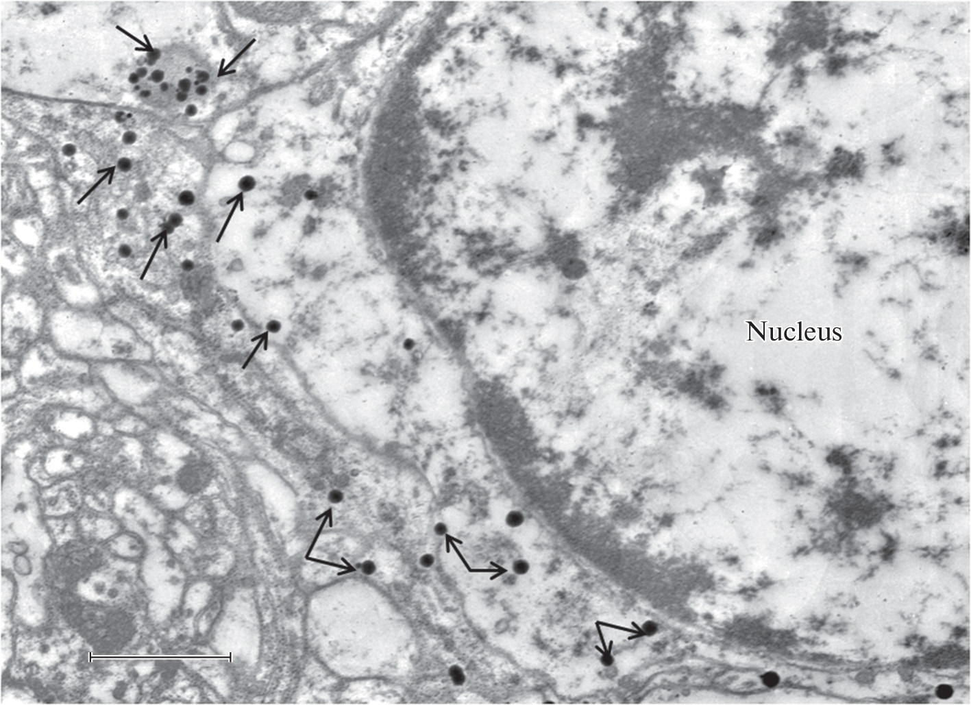 Gamma aminobutyric acid (GABA) plays an important role in regulating the development and functioning of the brain. The aim of this work was to study the involvement of GABA contained in non-neuronal cells in the differentiation and maturation of rat neocortical grafts. Pieces of fetal somatosensory neocortex were transplanted into the acute cavity of the homotopic region of the cortex of adult male rats. 4 months after the operation, the histological and electron microscopic examinations of the grafts were performed. The grafts were well vascularized and consisted of neuronal and glial cells. The localization of GABA in non-neuronal cells was studied by an ultrastructural immunocytochemistry using antibodies conjugated with colloidal gold. The highest expression of immunolabels in the form of electron-dense globules ranging in size from 20 to 60–80 nm was found in protoplasmic astrocytes and their processes. The pericapillary astrocytic endfeets also contained GABA-positive granules. In addition, GABA-positive granules have been observed in some myelin-forming cells and in the endothelial wall of blood vessels. The results obtained showed that GABAergic signaling via non-neuronal cells is involved in the morphofunctional differentiation of the transplanted neocortical tissue.