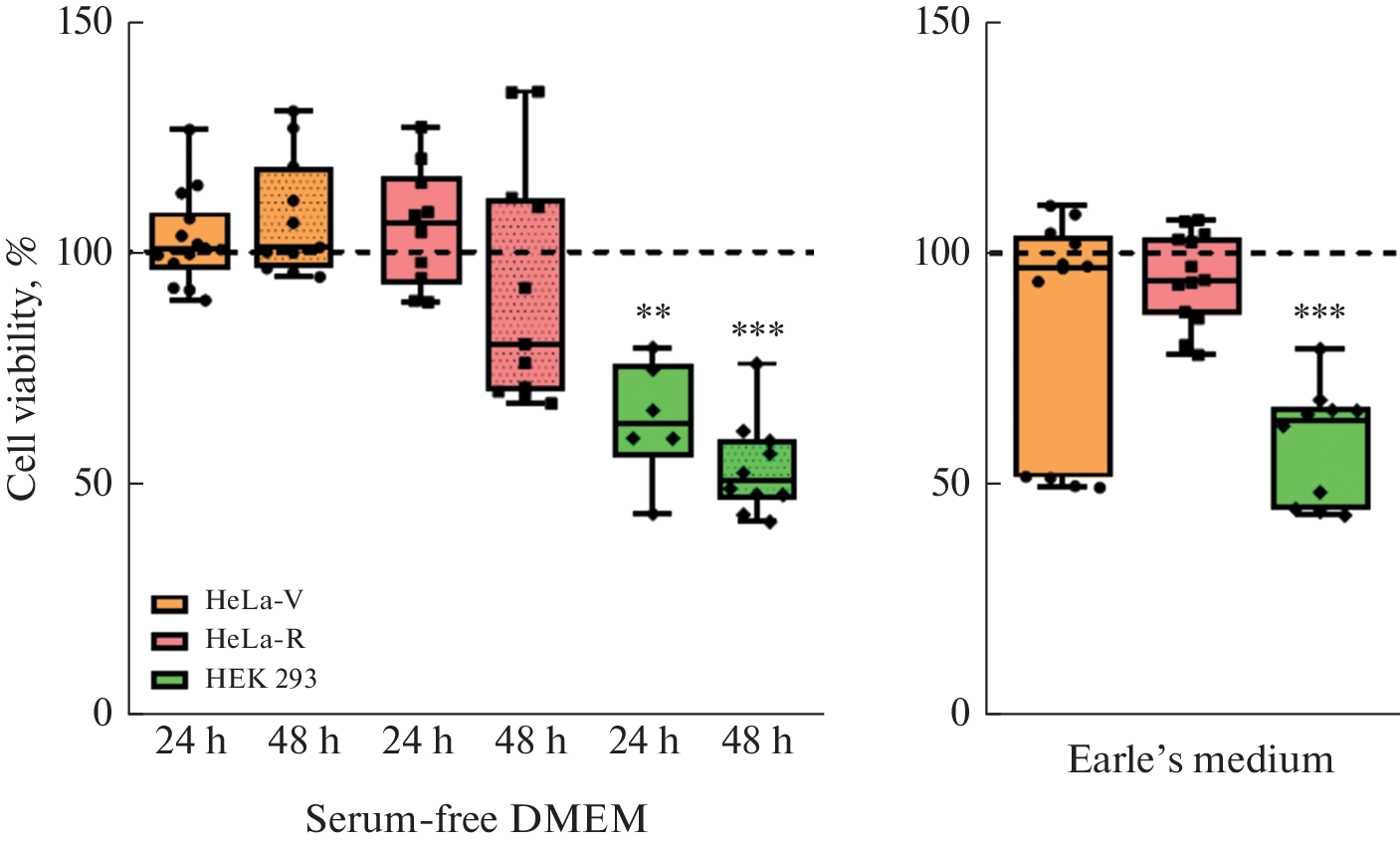 Целью исследования было сравнение степени развития аутофагии в клетках карциномы шейки матки человека HeLa-V и HeLa-R и в неопухолевых клетках эмбриональных почек человека HEK 293 в условиях голодания двух типов – 24- и 48-часового культивирования в среде DMЕM без сыворотки и 4-часовой инкубации в минимальной среде Эрла. В работе оценивали жизнеспособность клеток методом МТТ и экспрессию генов апоптоза (BCL2, BAX, CASP3) и аутофагии (ULK1, BECN1, ATG5, ATG14, MAP1LC3B) методом ПЦР в реальном времени. Культивирование в условиях сывороточного голодания и в среде Эрла привело к значительному снижению жизнеспособности клеток HEK 293, но не оказало влияния на клетки HeLa-V и HeLa-R. В опухолевых клетках обеих линий увеличивалась экспрессия гена антиапоптотического белка BCL2, в то время как в клетках HEK 293 снижалось соотношение генов BCL2/BAX и активировался ген CASP3. В клетках HeLa-V и HeLa-R в условиях недостатка питательных веществ наблюдались различные комбинации стимуляции генов начальных этапов аутофагии ULK1, BECN1, ATG5 и ATG14, но ни один из вариантов обработки не влиял на экспрессию гена MAP1LC3B. В клетках HEK 293 сывороточное голодание привело к увеличению уровня экспрессии генов BECN1, ATG5, ATG14 и MAP1LC3B. Таким образом, стимуляция аутофагии в клетках HeLa, особенно HeLa-R, препятствует развитию процессов апоптоза, в то время как в клетках HEK 293 процессы апоптоза и аутофагии происходят параллельно. Культивирование в среде DMEM без сыворотки в течение 48 ч является наиболее эффективным способом индукции аутофагии в клетках опухолевых линий и соответственно наиболее подходящей моделью для изучения роли аутофагии в развитии их резистентности к апоптотическому пути гибели.