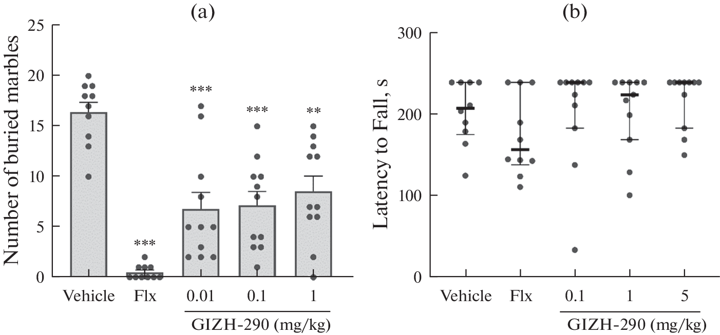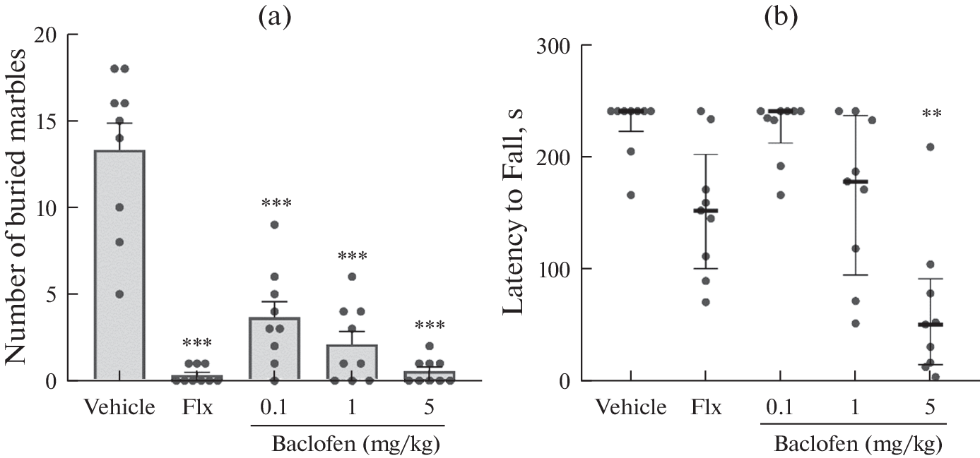 Обсессивно-компульсивное расстройство (ОКР) – психическое заболевание, характеризующееся обсессиями, которые вызывают выраженный дистресс и тревогу, и/или компульсиями, направленными на нейтрализацию дистресса и тревоги. Результаты экспериментальных и клинических исследований свидетельствуют о возможной роли ГАМКВ-рецепторов в патогенезе ОКР, что делает актуальным изучение влияния лигандов этих рецепторов на компульсивноподобное поведение грызунов. Цель работы – изучение эффектов ГИЖ-290 и баклофена на экспериментальных моделях ОКР. Изучены эффекты ГИЖ-290 (0.01, 0.1, 1 мг/кг, в/б) и баклофена (0.1, 1 и 5 мг/кг, в/б) в тестах “Вращающийся стержень” и “Закапывание шариков”, а также на модели нарушения спонтанного чередования у мышей, вызванного введением 8-OH-DPAT. Показано, что баклофен и ГИЖ-290 во всех исследуемых дозах ослабляли компульсивноподобное поведение мышей – уменьшали количество зарытых шариков в тесте “Закапывание шариков”, однако этот эффект баклофена в дозе 5 мг/кг сопровождался нарушением двигательной координации животных в тесте “Вращающийся стержень”. В то же время ни баклофен, ни ГИЖ-290 не ослабляли нарушение спонтанного чередования у мышей, вызванное введением 8-OH-DPAT (2 мг/кг, в/б), напротив, баклофен в дозе 1 мг/кг усиливал это нарушение. Таким образом, баклофен и ГИЖ-290 обладают антикомпульсивной активностью в тесте “Закапывание шариков”, но не на модели нарушения спонтанного чередования у мышей, вызванного введением 8-OH-DPAT.