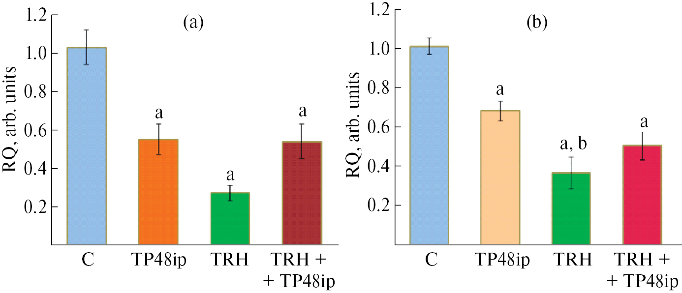 Рис. 1. Влияние внутрибрюшинно вводимого TP48 (a) и перорально вводимого TPY5 (b) на экспрессию гена рецептора ТТГ (Tshr) в щитовидной железе крыс с обработкой тиролиберином и без таковой. Различия статистически значимы при p < 0.05 при сравнении с контролем (ᵃ) и группами TP48ip или TPY5or (ᵇ). Значения представлены как M ± SEM, во всех группах n = 6. Для сравнения групп использовали однофакторный дисперсионный анализ (ANOVA), апостериорный анализ проводили с использованием теста Тьюки.