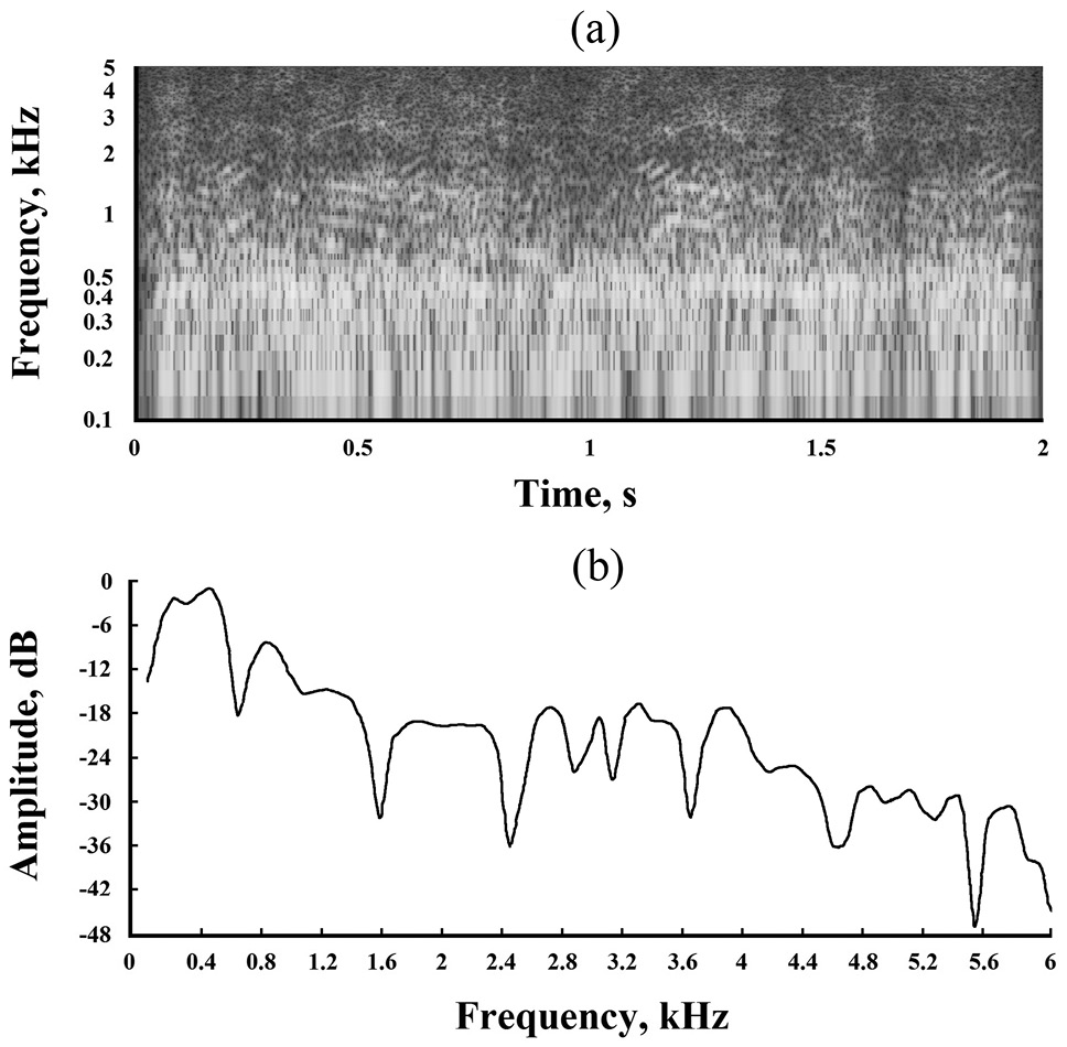 Рис. 1. Спектральные характеристики шума многоголосия. (a) – спектрограмма, (b) – амплитудно-частотный спектр.