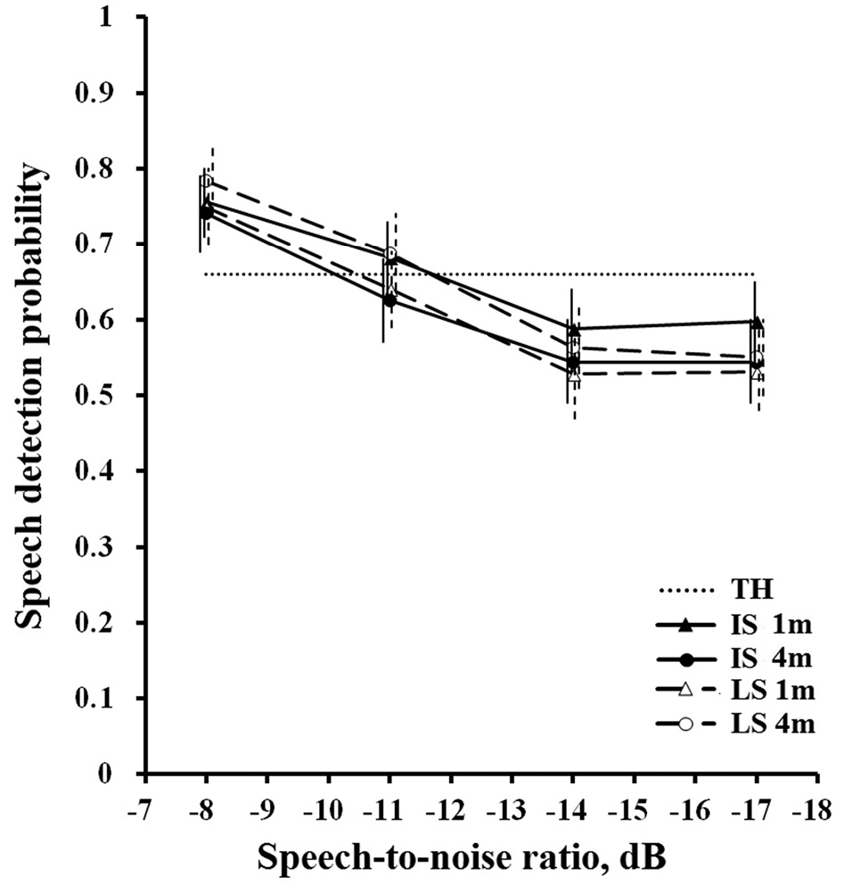 Рис. 2. Обнаружение обычного и ломбардного речевого сигнала при разных положениях источника целевого сигнала и шума многоголосия. По абсциссе – соотношение сигнал/шум (дБ); по ординате – вероятность обнаружения речевого стимула на фоне шума многоголосия; TH – порог обнаружения стимула; IS – стимул с обычной речью; LS – стимул с ломбардной речью; 1 m – источник целевого сигнала расположен на расстоянии 1 м от слушателя; 4 m – источник целевого сигнала расположен на расстоянии 4 м от слушателя. Вертикальные линии – доверительный интервал (n = 320).