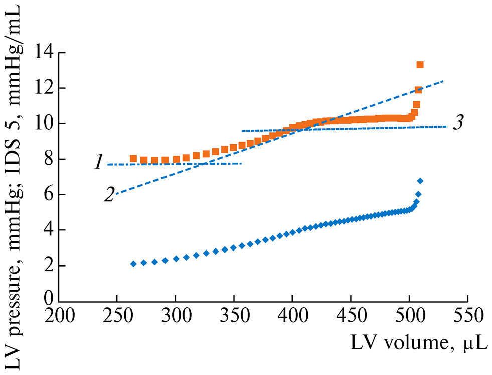 Рис. 1. Соотношение объема ЛЖ и давления в нем (нижняя кривая) во время диастолы, а также соотношение объема ЛЖ и расчетного индекса диастолической упругости № 5 (ИДУ, верхняя кривая) в течение диастолы. В начальном (1) и конечном (3) сегментах кривой ИДУ постоянен, а в средней части (2) индекс возрастает.