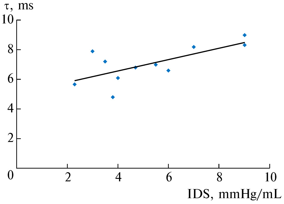 Единственным исключением является индекс № 4, он практически не зависел от гемодинамических условий опыта и показал умеренную незначимую зависимость только от константы времени расслабления (рис. 2). Его преимущество также состоит в относительной простоте измерения, требуется вычислить всего два показателя в конце и начале диастолы. Поэтому есть основания полагать, что он лучшим образом из представленных индексов способен характеризовать диастолическую упругость ЛЖ.