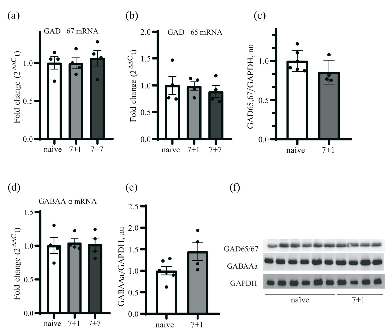 Рис. 1. Анализ белков, участвующих в ГАМКергической нейротрансмиссии в НБЧ крыс линии КМ после 7-дневного киндлинга: экспрессия мРНК GAD67 (a) и GAD65 (b) в НБЧ у наивных животных и у крыс через 24 ч и через 7 дней после киндлинга не отличалась; Вестерн-блот анализ не выявил изменений в содержании белков GAD65 и GAD67 в НБЧ у крыс КМ через 24 ч после киндлинга (c, f); экспрессия мРНК α1-субъединицы рецептора GABAA в НБЧ у наивных животных и через 24 ч после киндлинга не отличалась (d); Вестерн-блот анализ не выявил изменений в содержании α1-субъединицы рецептора GABAA через 24 ч и через 7 суток после киндлинга (e, f). Репрезентативные изображения иммуноблота (f). Графики результатов анализа ПЦР в реальном времени показывают изменение экспрессии мРНК по сравнению с наивными животными. Значения нормированы на среднее геометрическое референсных генов. Графики результатов Вестерн-блот анализа показывают оптическую плотность иммунопозитивного вещества, произвольные единицы (a. u.). Данные представлены как среднее ± SEM.