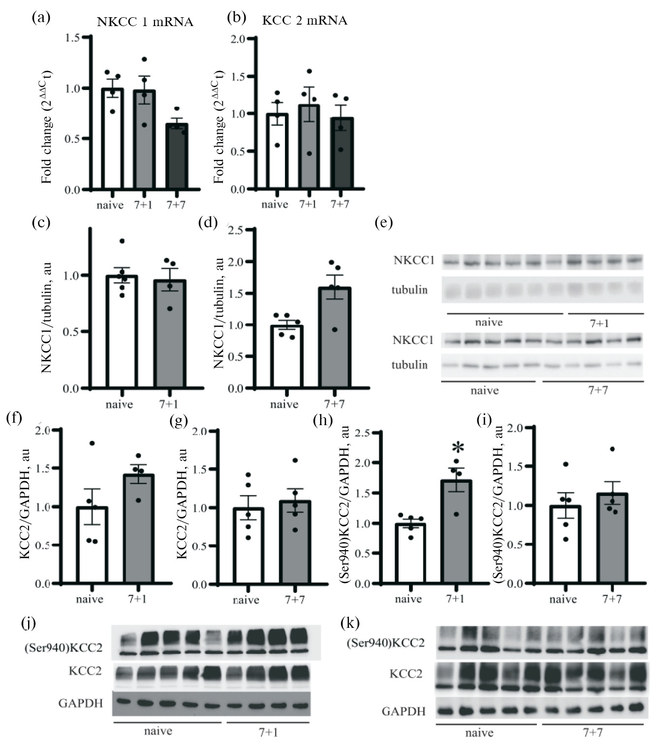 Поскольку GABAА-рецепторы являются каналами для ионов хлора, изменение концентрации хлорид-ионов в нейронах может изменить функциональные свойства рецепторов [21]. Ключевыми регуляторами внутриклеточной концентрации хлора в нейронах являются два котранспортера: натрий-калий-два-хлор котранспортер (NKCC1) и калий-хлор-котранспортер (KCC2) [22]. Сравнив экспрессию NKCC1 и KCC2 в НБЧ крыс через сутки и спустя неделю после семидневного киндлинга, мы показали, что экспрессия белка и мРНК NKCC1 остается неизменной через сутки после семидневного киндлинга и остается на том же уровне после недели отдыха (рис. 2a, c, e). Экспрессия мРНК KCC2 (рис. 2b) и общее содержание белка оставались на том же уровне, что и у контрольных животных (рис. 2f, j). Анализ содержания фосфорилированной (по Ser940) формы KCC2 в НБЧ показал, что семикратное предъявление звукового стимула вызывает достоверное увеличение фосфорилированной (активной) формы KCC2 спустя сутки после киндлинга (рис. 2h, j). Через неделю уровень экспрессии мРНК KCC2 и NKCC1 (рис. 2a, b) и содержание белков KCC2 и NKCC1, а также фосфорилированного KCC2 не отличались от контрольных значений (рис. 2g, i, k).