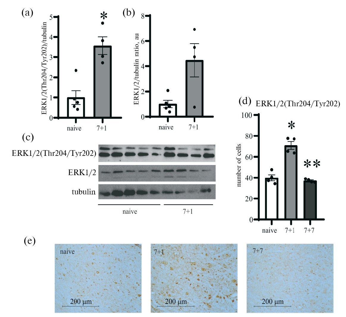 Рис. 4. Анализ содержания фосфо-ERK1/2 в НБЧ крыс линий КМ после 7-дневного киндлинга. На графиках представлены результаты Вестерн-блот анализа фосфорилированного (a) и общего белка ERK1/2 (b) в НБЧ наивных крыс линии КМ и через 24 ч после окончания последнего припадка. Графики показывают увеличение оптической плотности фосфо-ERK1/2-киназ, произвольные единицы (a. u.). Репрезентативные изображения иммуноблотов (c). Иммуногистохимическим методом показано увеличение числа фосфо-ERK1/2 иммунопозитивных клеток в НБЧ крыс линии КМ через 24 ч после киндлинга (d). Репрезентативные изображения фосфо-ERK1/2–иммунореактивного вещества на гистологических препаратах НБЧ (e). Данные представлены как среднее ± SEM. *р < 0.05 по сравнению с контролем, ** p ˂ 0.01 отличия между группами крыс, декапитированных через сутки и через 7 дней после последнего припадка.