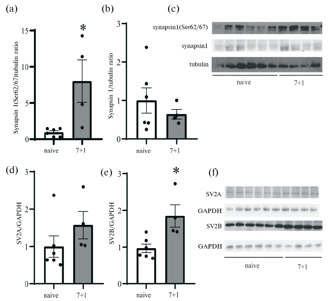 Экзоцитоз является одним из механизмов регуляции глутаматергической нейротрансмиссии, в том числе за счет регуляции ERK1/2-киназами активности белка синапсин 1. Кроме того, показано, что эпилептиформная активность связана с повышенным уровнем фосфорилирования синапсина 1 в положении Ser62/Ser67, регулируемого киназами ERK1/2 [24–26]. Мы сравнили экспрессию и фосфорилирование (по Ser62/Ser67) синаптического белка синапсина 1 и везикулярных синаптических белков SV2A и SV2B у контрольных животных и у животных через 24 ч после последней судороги. Оказалось, что содержание фосфорилированного синапсина 1 (Syn1(Ser62/Ser67)) значительно повышалось после семи судорожных припадков, в то время как общее содержание синапсина 1 в НБЧ оставалось неизменным (рис. 5a, b, c). Помимо экспрессии и уровня фосфорилирования синапсина 1, мы оценивали содержание в НБЧ синаптических гликопротеинов SV2A и SV2B, для которых показано изменение экспрессии при височной эпилепсии [27, 28]. При сравнении экспрессии белков SV2A и SV2B в НБЧ у крыс, перенесших 7 АСП, и контрольных животных мы обнаружили, что экспрессия SV2A оставалась неизменной (рис. 5d, f), а содержание белка SV2B, характерного для глутаматергических нейронов, возрастало в результате киндлинга (рис. 5e, f), что также свидетельствует об усиленном выбросе глутамата.