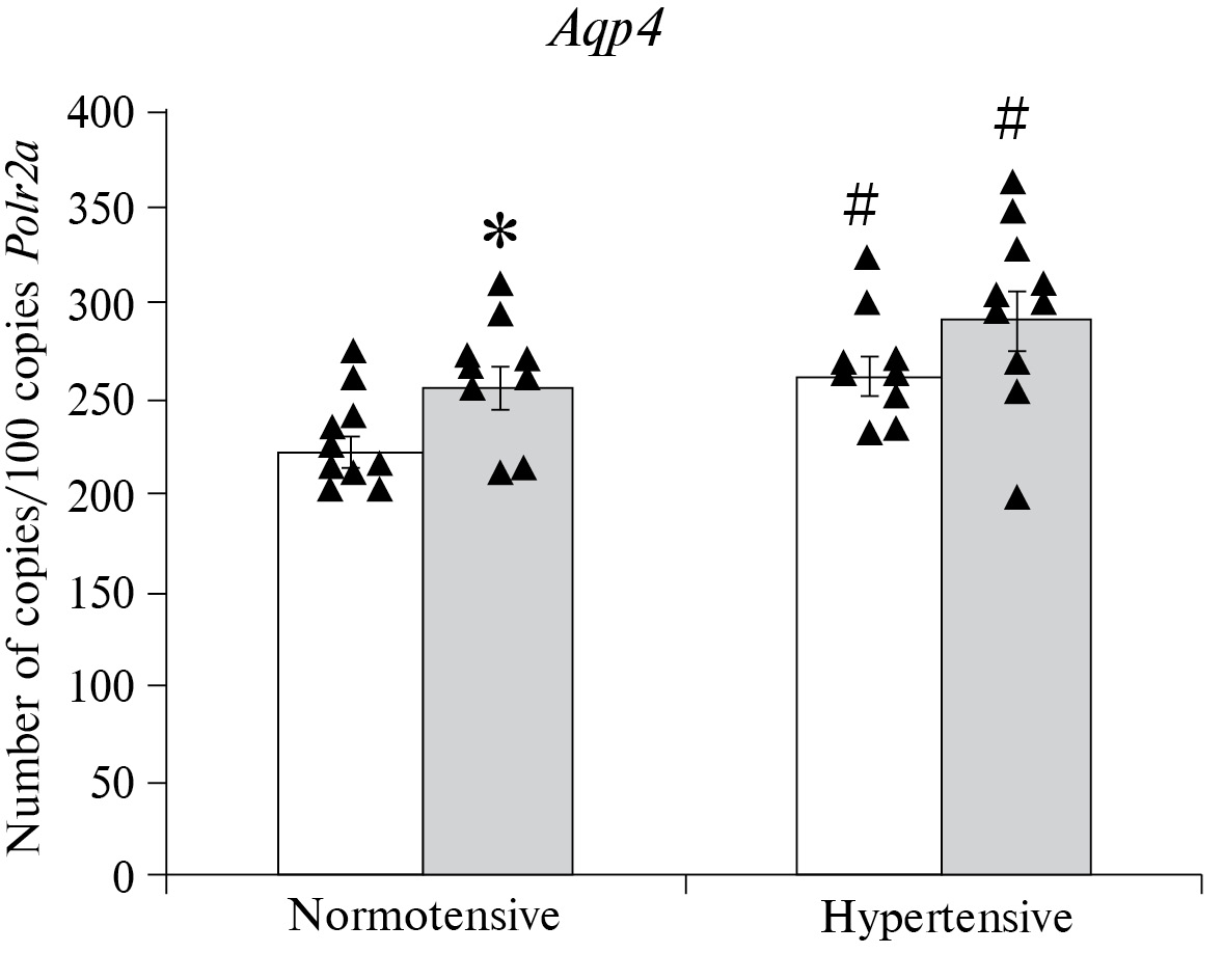 Рис. 2. Экспрессия гена Aqp4 в переднем (белые столбцы) и заднем (серые столбцы) гипоталамусе нормо- и гипертензивных крыс. * – достоверные различия между отделами гипоталамуса; # – достоверные различия между нормо- и гипертензивными животными, р < 0.05. Индивидуальные значения представлены на рисунке треугольниками.