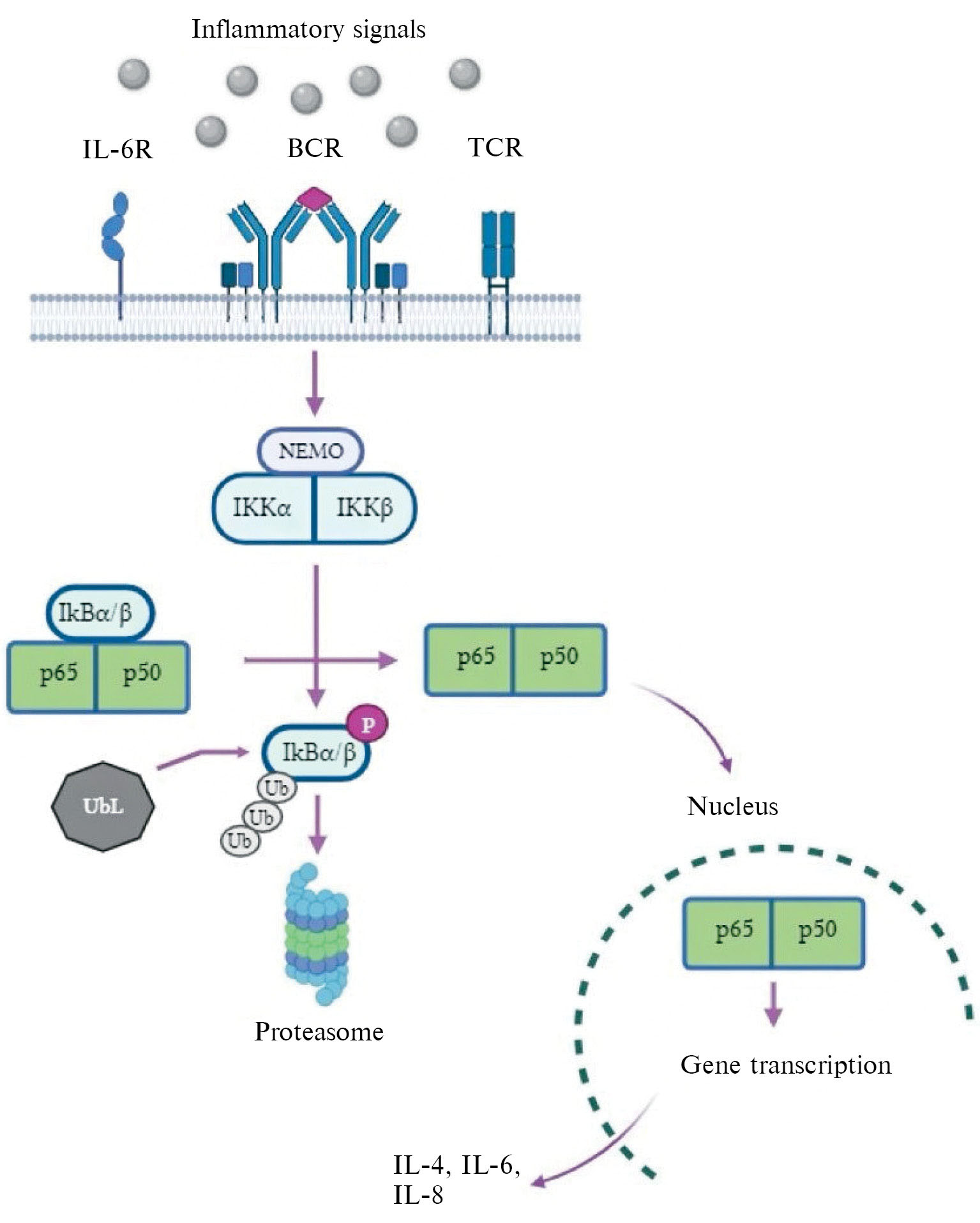 Рис. 2. Канонический NEMO-зависимый NF-κB сигнальный путь. Активация сигнального пути происходит через связывание различными рецепторами клеток своих лигандов. Далее происходит фосфорилирование IKK-комплекса, включающего NEMO, IKKα и IKKβ. Этот комплекс также фосфорилирует IkBα/β, что ведет к полиубиквитинированию IkBα/β и деградации протеасомой. После этого комплекс p65/p50 транслоцируется в ядро и активирует экспрессию воспалительных генов (IL-4, IL-6, IL-8 и т.д.). BCR – B-клеточный рецептор, TCR – Т-клеточный рецептор, IL6R – рецептор IL-6, NEMO – NF-κB-модификатор, UbL – убиквитин-подобный белок, Ub – убиквитин, P – остаток фосфорной кислоты.