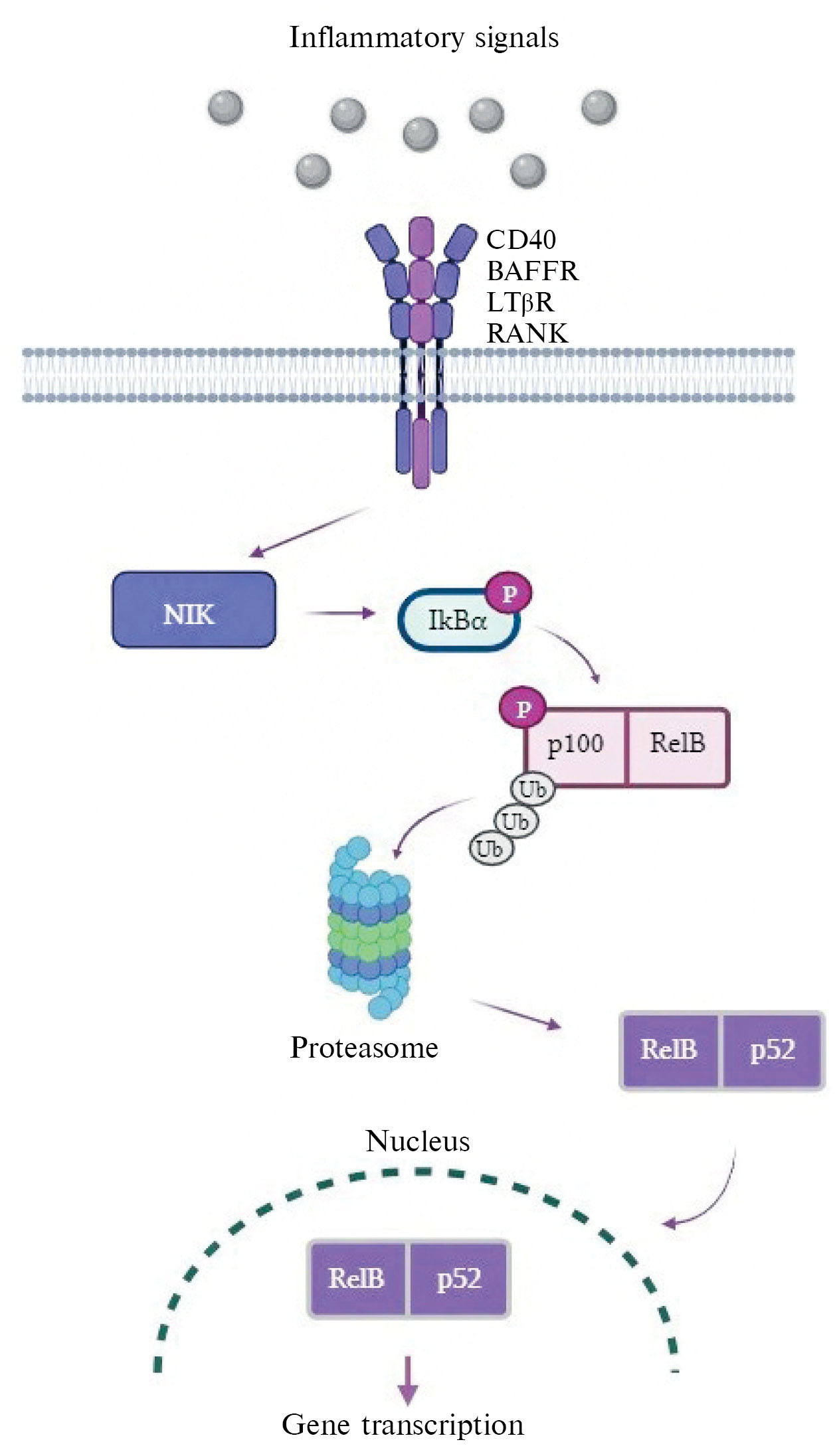 Активация неканонического пути NF-κB вовлекает различные сигнальные молекулы и приводит к преимущественной активации димера NF-κB2/RelB. Этот путь основан на процессинге белка-предшественника NF-κB2 – p100. Активация киназы NIK (митоген-активируемая белковая киназа 3) приводит к фосфорилированию IKKα киназой p100/NF-κB, которая после фосфорилирования p100 подвергается убиквитинилированию и протеосомной деградации [21].