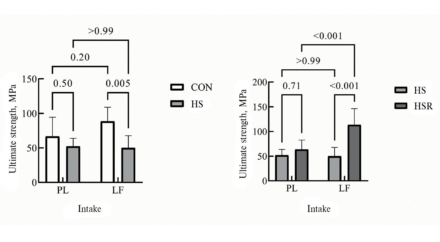 В то же время предел прочности был достоверно выше для групп CL и HSLR по отношению к группе HSL, а также для группы HSLR по отношению к HSPR (рис. 2). Различия между другими парами были незначимы.