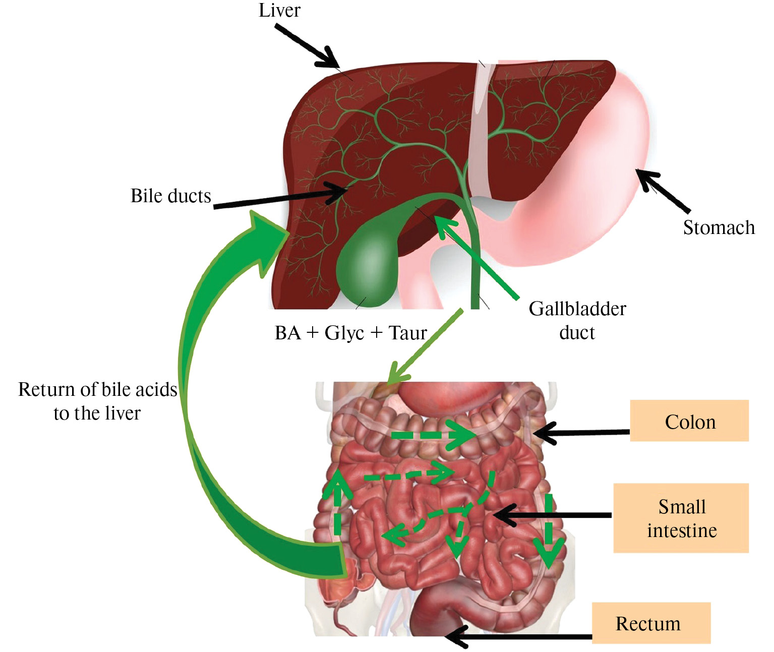 Рис. 2. Энтерогепатическая циркуляция желчи и микробная переработка желчных кислот. Большая зеленая стрелка – пассивная абсорбция и активный транспорт желчи из кишечника в печень. Маленькие сплошные зеленые стрелки отражают направление потока желчи. Пунктирные стрелки отображают воздействие микробиоты. BA+Glyc+Taur – в состав желчи входят желчные кислоты, глицин и таурин.