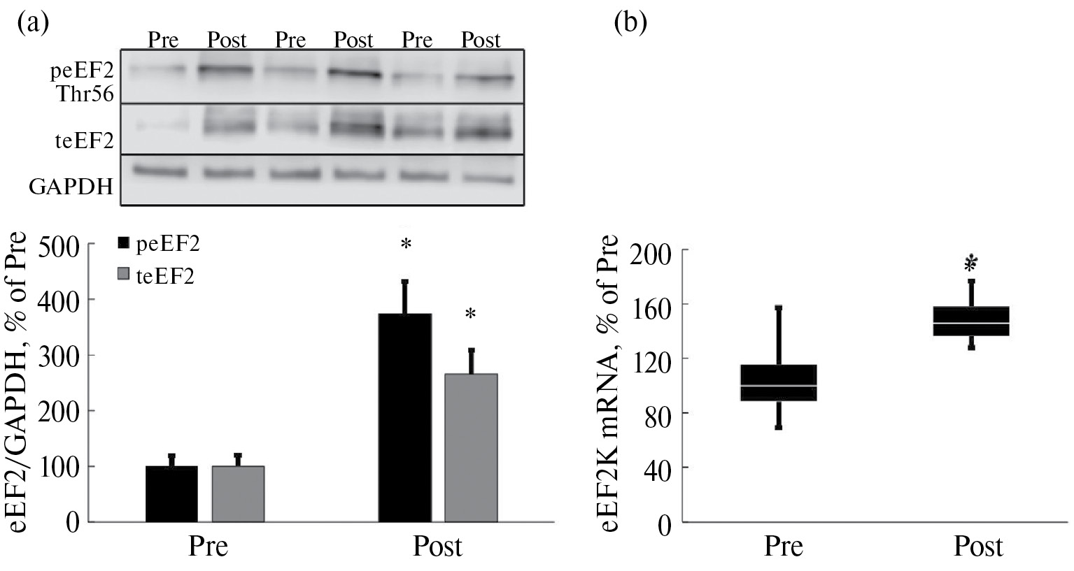 Рис. 2. Уровень фосфорилирования и содержания тотальной формы eEF2 (a). Экспрессия мРНК eEF2K (b). Pre – до АНОГ, Post – после АНОГ. * – достоверное отличие от Pre.