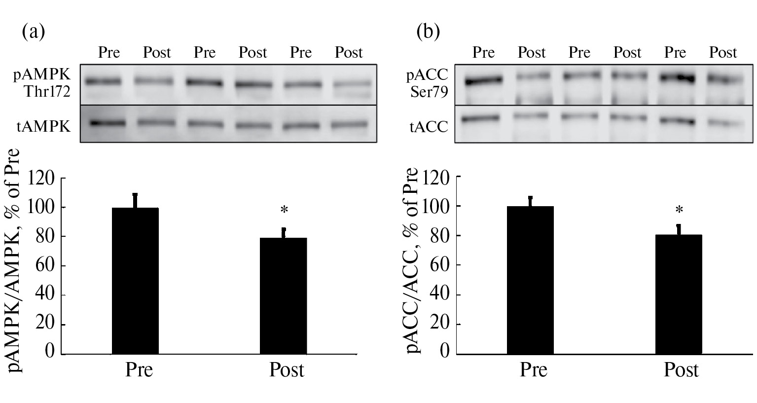 Рис. 3. Уровень фосфорилирования AMPK (a) и ACC (b). Pre – до АНОГ, Post – после АНОГ. * – достоверное отличие от Pre.