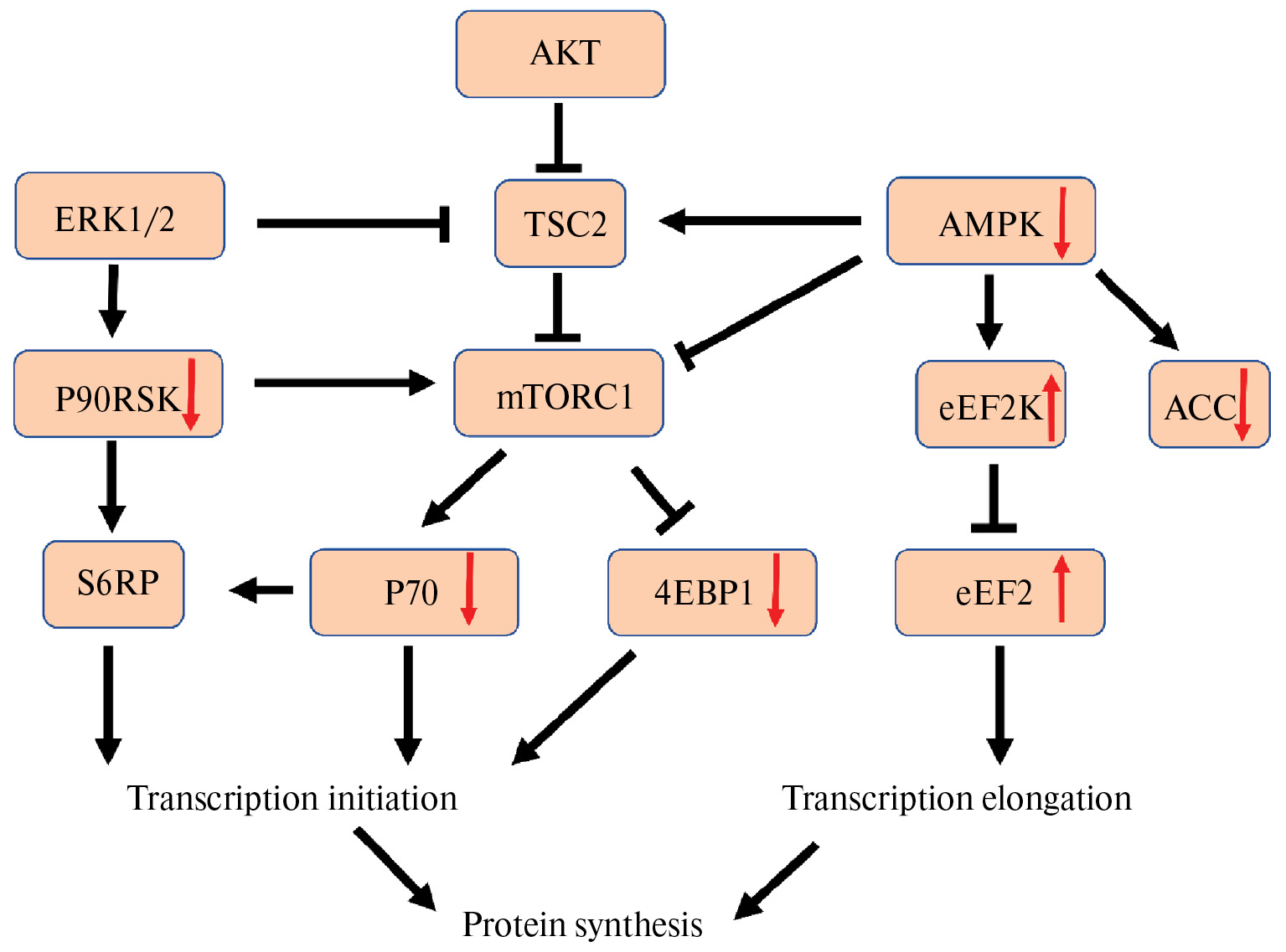 Рис. 4. Факторы регуляции инициации и элонгации трансляции (адаптировано из Mirzoev и соавт. [63]). AKT – протеинкиназа B; AMPK – АМФ-активируемая протеинкиназа; eEF2K – киназа фактора элонгации эукариот 2; mTORC1 – мишень рапамицина у млекопитающих – комплекс 1; p70S6K – рибосомальная киназа p70; p90RSK – рибосомальная киназа p90; rpS6 – рибосомальный белок S6; TSC2 – комплекс туберозного склероза 2; 4EBP1 – белок, связывающий фактор инициации трансляции 4E. Красными стрелками обозначены изменения фосфорилирования и содержания, изученные в данной статье.