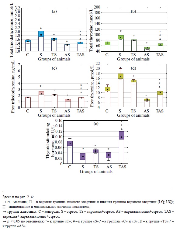 5.Тироксин +адреналэктомия +стресс | 19.94 (15.53; 21.30) | 52.87 (46.86; 60.19) | 49.06 (43.18; 56.34) | 3.97 (2.45; 5.29) |