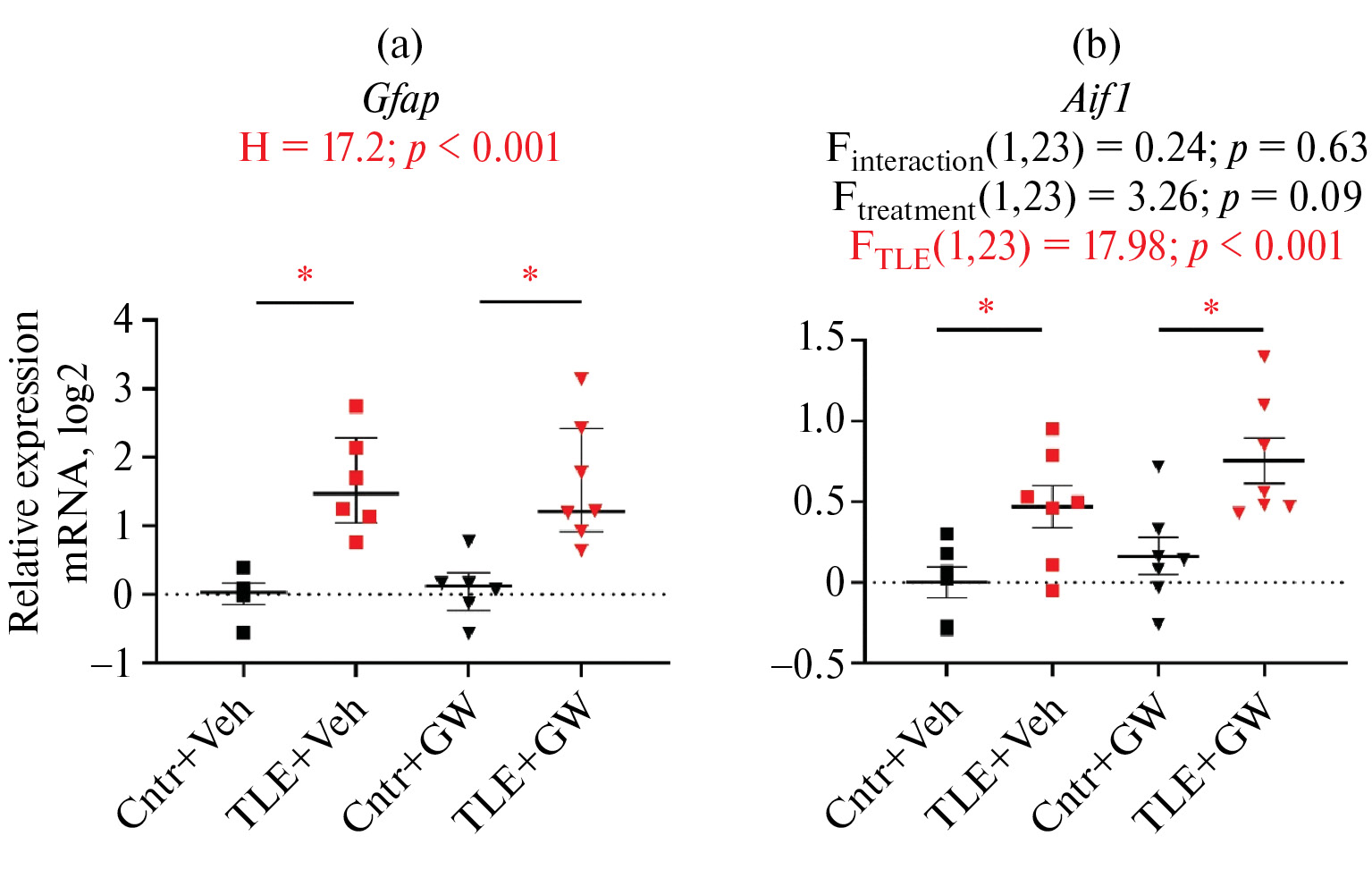 Рис. 2. Относительная экспрессия генов маркера активации астроцитов Gfap (a) и микроглиальных клеток Aif1 (b) в дорзальном гиппокампе экспериментальных и контрольных крыс; * р < 0.05, двухфакторный ANOVA (модель х лечение) с апостериорным тестом множественных сравнений Сидака или непараметрический аналог ANOVA тест Крускала – Уоллиса с апостериорным тестом множественных сравнений Данна.