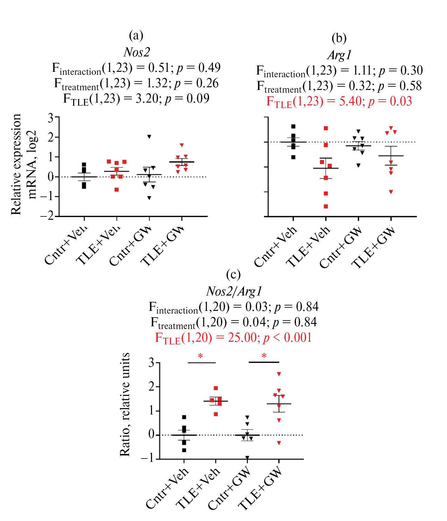 Экспрессия гена маркера M1 микроглии Nos2 немного усиливалась у TLE крыс, однако различия не достигали статистической значимости (F1,22 = 3.20; p = 0.09, рис. 5). При этом TLE приводила к уменьшению продукции мРНК маркера защитного М2 фенотипа Arg1 (F1,22 = 5.40; p = 0.04). Известно, что в макрофагах и микроглии ферменты аргиназа (ген Arg1) и индуцибельная NO-синтаза (ген Nos2) конкурируют за субстрат L-аргинин, что может активировать внутриклеточные каскады, связанные с продукцией защитных (М2) или провоспалительных (M1) факторов [58]. Поэтому мы дополнительно проанализировали соотношение Arg1/Nos2 как показатель баланса нейропротекторных и повреждающих механизмов. Соотношение Arg1/Nos2 снижалось (F1,20 = 25.00; p < 0.001), что свидетельствует о превалировании активности М1 микроглии у TLE крыс. Кардарин значимо не влиял на эти изменения.