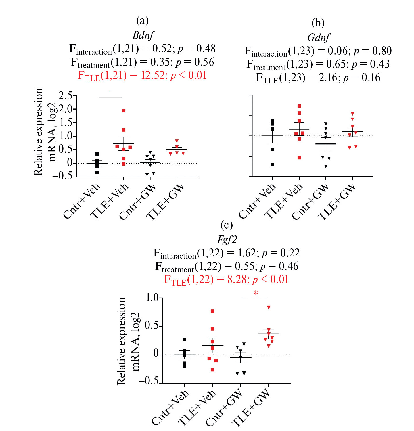 Далее мы исследовали экспрессию генов нескольких трофических факторов, вовлеченных в регуляцию эпилептогенеза – Bdnf, Gdnf и Fgf2 (рис. 6). Экспрессия Bdnf и Fgf2 увеличивалась у TLE животных (соответственно F1,21 = 12.52; p < 0.01 и F1,22 = 8.28; p < 0.01), при этом при межгрупповом сравнении достоверные отличия от контроля для Bdnf выявлены у нелеченых, а для Fgf2 – у леченых крыс.