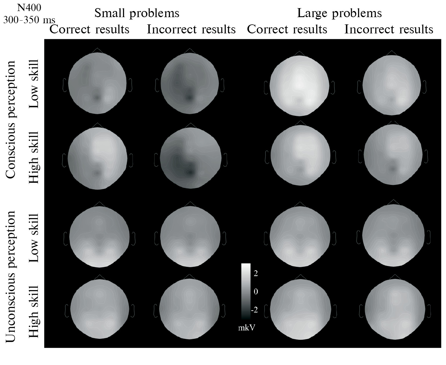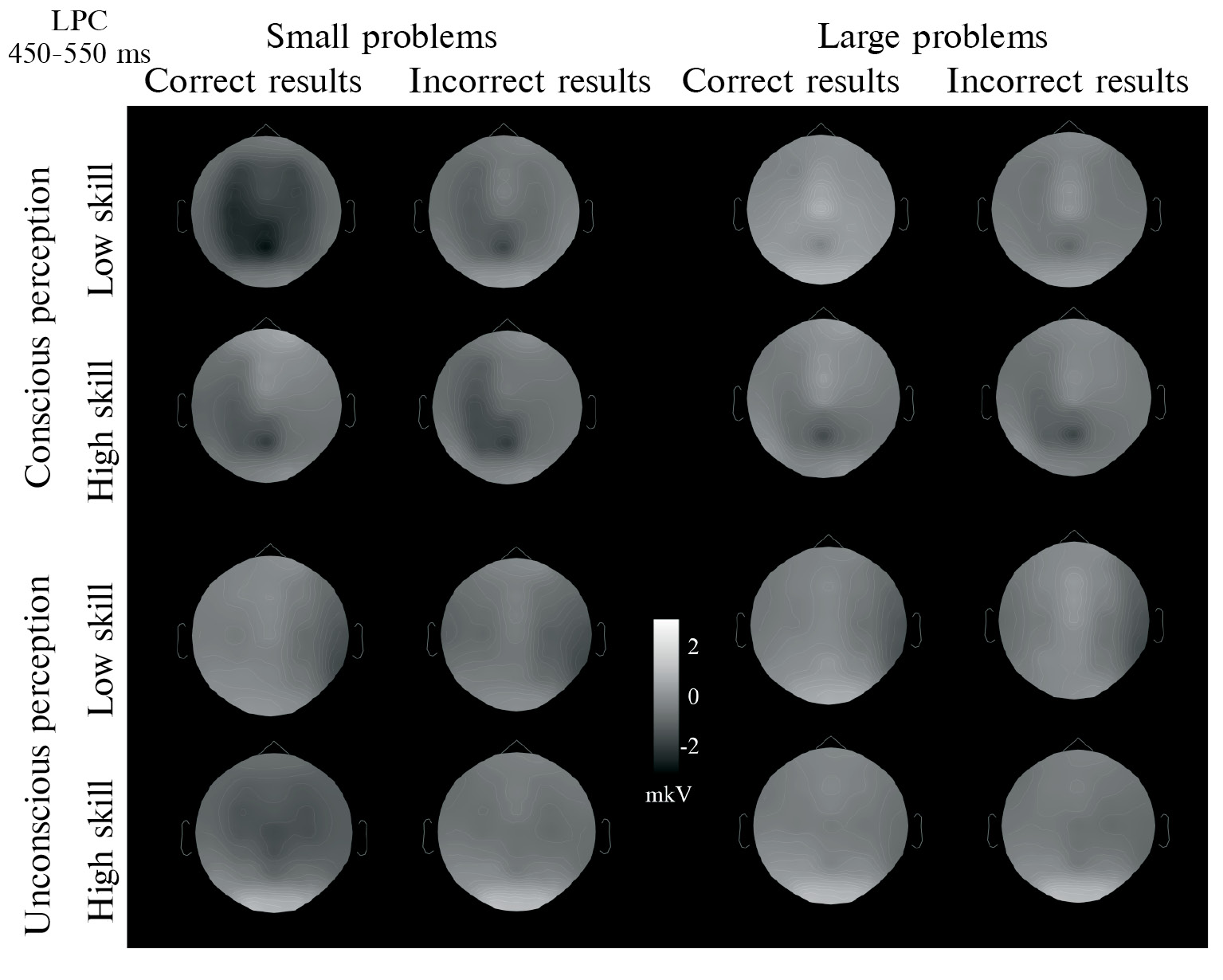 В настоящий момент имеется крайне мало электрофизиологических исследований природы неосознаваемого восприятия при обработке арифметических примеров. По имеющимся данным, в задачах с отсутствием внимания или замаскированным предъявлением примера наблюдалось возникновение эффекта, по временным и пространственным характеристикам похожего на арифметический эффект волны N400 [20, 21]. Эти данные похожи на результаты, получаемые в задачах семантического прайминга, где в случае замаскированного предъявления прайма наблюдается генерация компонента N400, что интерпретируется как автоматическая природа волны N400 и контролируемая – волны LPC [32]. С другой стороны, при выполнении задания со смещенным вниманием был обнаружен эффект, имеющий топографическое сходство с волной Р600/LPC, который авторы связывают с отложенной сознательной оценкой арифметических фактов [20].