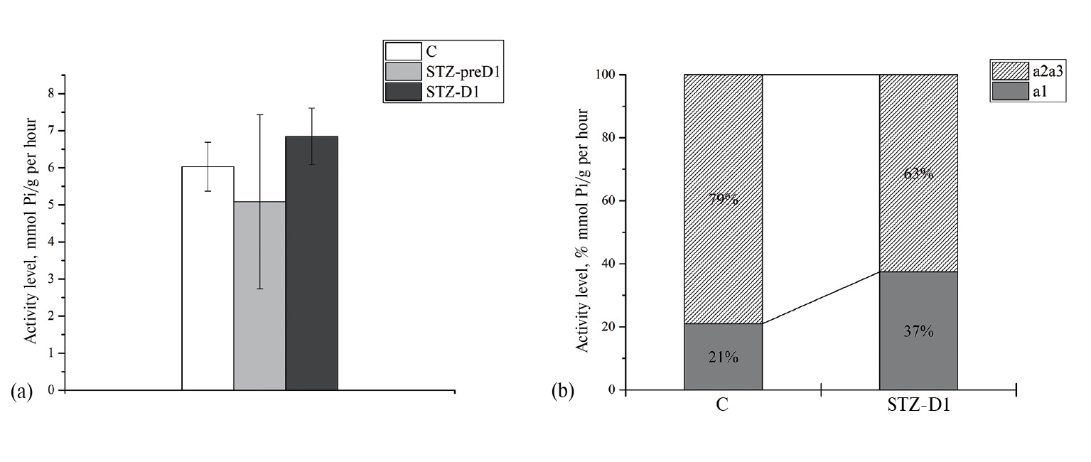 Уровень фракций высокочувствительной к уабаину Na+/K+-АТФаза (α2-, α3-изоформы) в группах С и STZ-D1, обнаруженный нами в данном исследовании, превышает пределы этой фракции, описанные в работах [1, 32, 35, 39], но, тем не менее, соответствует литературным данным [1, 36, 39], где описано, что при развитии СД1 пропорции α1/α2 изоформ существенно не меняются. В одной работе описано, что при 6-недельном STZ-D1 снижается количество высокоаффинных к уабаину связывающих мест (α2-, α3-изоформы), но не низкоаффинных (α1-изоформа) [37].