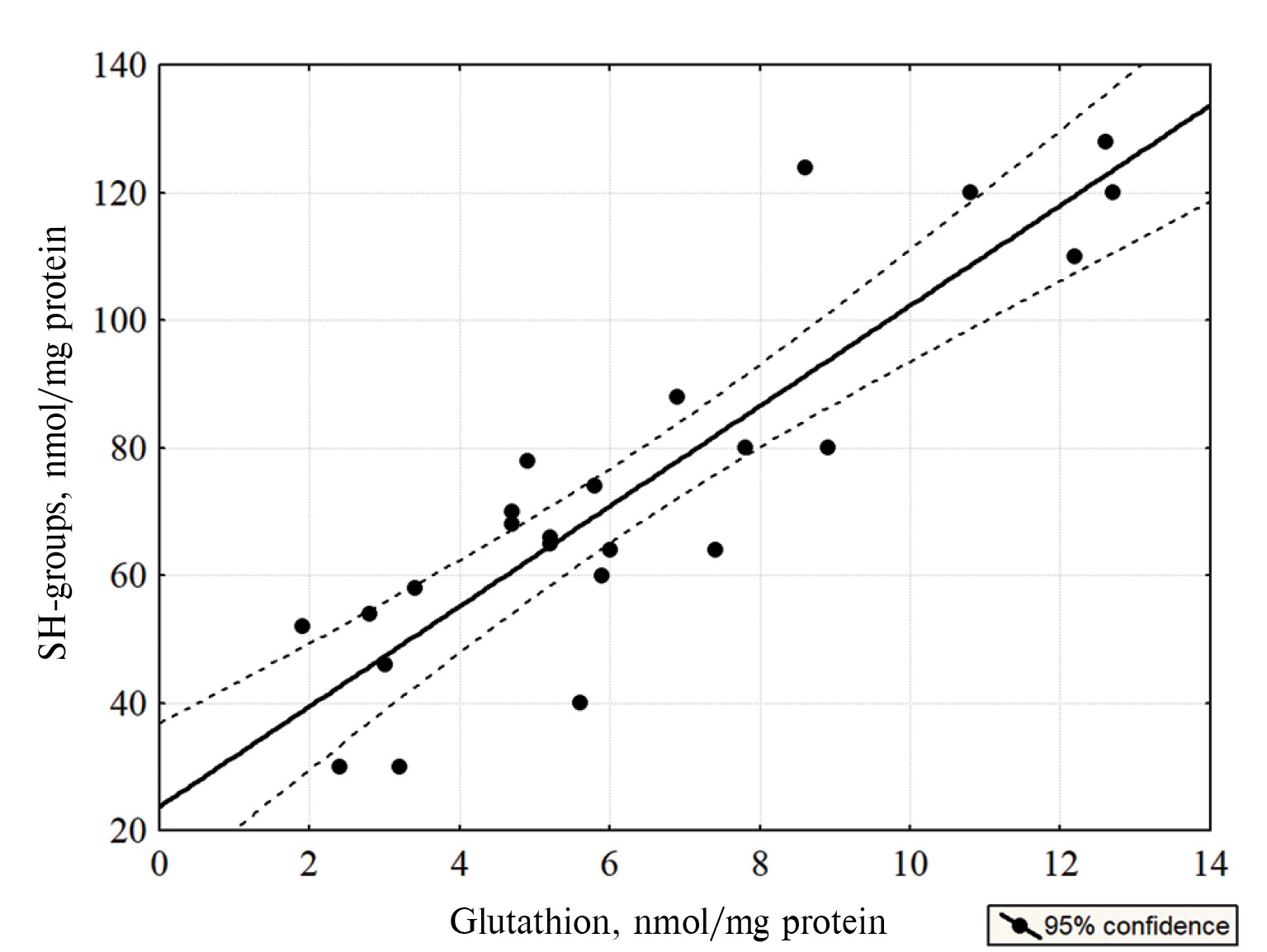 Рис. 1. Корреляционные связи между уровнем глутатиона и содержанием сульфгидрильных групп в белках митохондрий печени крыс при различных физиологических состояниях (контроль, курсовое ДГК, кратковременная гипотермия, умеренная гипотермия на фоне курсового введения ДГК). r = 0.88, p < 0.05.