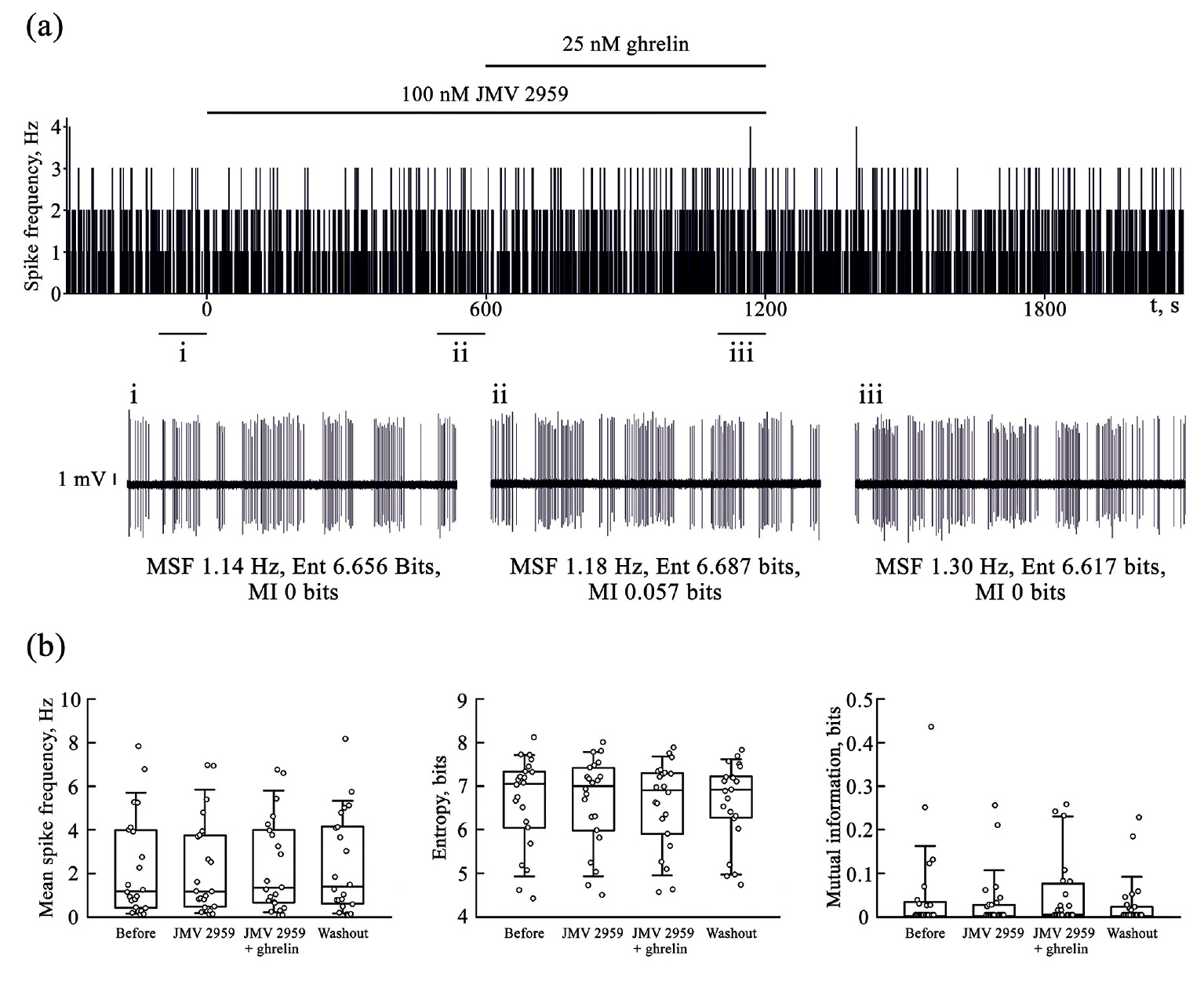 Поскольку активность грелина реализуется через GHS-R1a. рецепторы [25], в отдельной серии экспериментов на 22 нейронах супрахиазматического ядра изучены эффекты селективного антагониста этих рецепторов JMV 2959. Установлено, что аппликация данного антагониста в концентрации 100 нМ сама по себе не оказывает влияния на параметры спайковой активности нейронов, однако она эффективно предотвращает влияние 25 нМ грелина. Пример экспериментальной записи, представленный на рис. 3a, показывает отсутствие существенных изменений спайковой активности как в период действия антагониста, так и в период воздействия грелина на фоне JMV 2959. В данной серии экспериментов лишь в одном из 22 случаев (4.5%) зарегистрирован рост частоты спайков выше порогового уровня, принятого в настоящем исследовании (> 20%) под влиянием грелина на фоне антагониста GHS-R1a рецепторов, что значимо меньше (р < 0.05: z-тест), чем в первой серии экспериментов (26 из 81 нейрона). Ранговый тест ANOVA не выявил существенных изменений частоты спайков, энтропии распределения межспайковых интервалов и обоюдной информации между сопряжёнными межспайковыми интервалами по ходу эксперимента с использованием грелина на фоне антагониста GHS-R1a рецепторов (р > 0.05: ранговый тест ANOVA, n = 22). Статистические данные о значениях параметров спайковой активности на всех последовательных стадиях эксперимента представлены на рис. 3b. Таким образом, полученные результаты свидетельствуют о том, что влияние грелина на спайковую активность нейронов супрахиазматического ядра реализуется через GHS-R1a рецепторы.