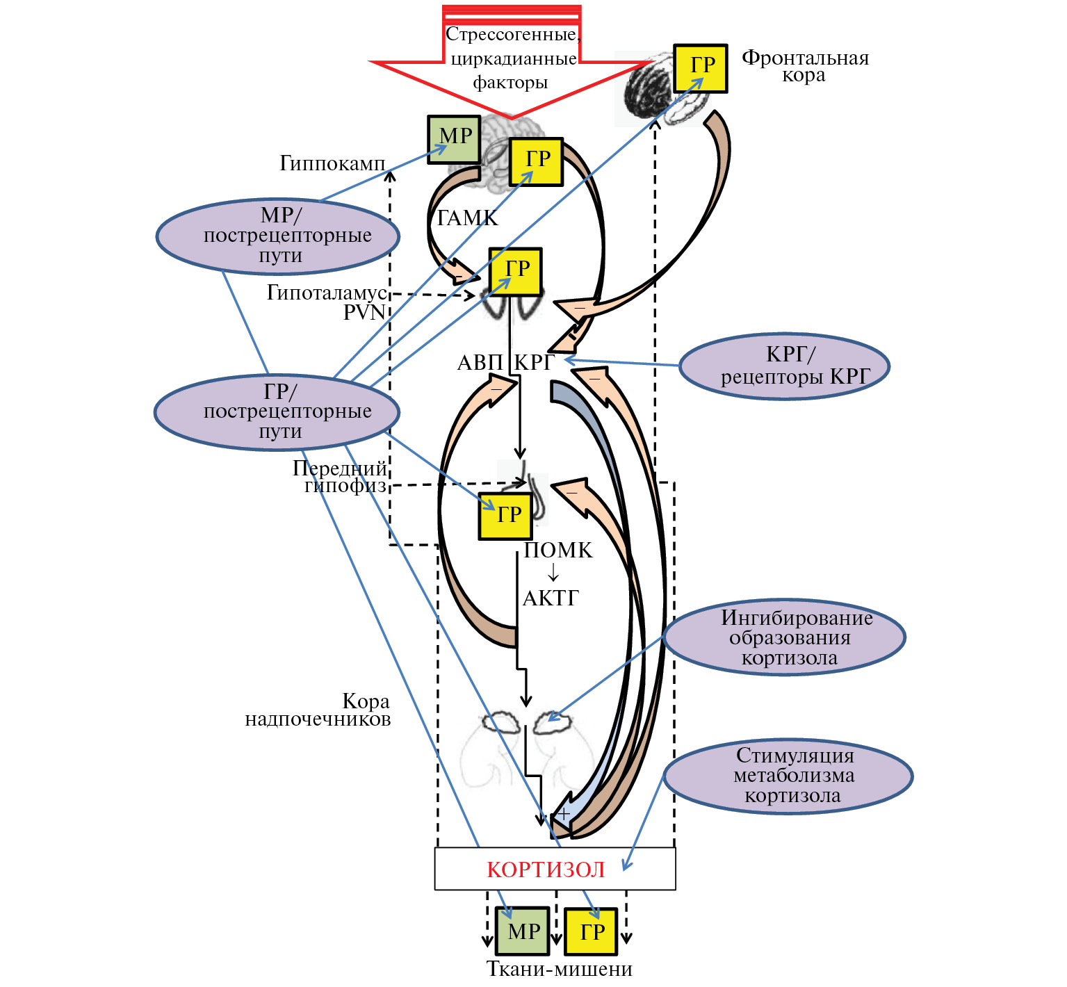 Рис. 1. Гипоталамо-гипофизарно-надпочечниковая ось (ГГНО) и потенциальные мишени антиглюкокортикоидной терапии [4, 5, 8, 15–17]. Схематическое изображение показывает каскадную природу оси ГГНО, основной нейроэндокринной оси, лежащей в основе стрессового ответа. Ключевые события этого каскада включают: высвобождение секретагогов кортикотропин-рилизинг-гормона (КРГ) и аргинин-вазопрессина (АВП) из медиального парвоцеллюлярного паравентрикулярного ядра (PVN) гипоталамуса в портальную циркуляцию гипофиза; расщепление проопиомеланокортина (ПОМК) до адренокортикотропного гормона (АКТГ) и выброс АКТГ из гипофиза в системную циркуляцию; синтез глюкокортикоидов (ГК) (кортизола у человека или кортикостерона у других видов, включая грызунов) в коре надпочечников и их выброс в системную циркуляцию; связывание глюкокортикоидов (ГК) с глюкокортикоидными рецепторами (ГР) и минералокортикоидными рецепторами (МР) в центральных и периферических тканях-мишенях, включая мозг, после прохождения через гематоэнцефалический барьер, и тем самым осуществление клеточных эффектов ГК. ГР экспрессируются в большинстве структур и областей мозга, связанных с ГГНО, в то время как лимбические структуры, в первую очередь гиппокамп, содержат также МР. Многоуровневые петли обратной связи от гипоталамуса, гипофиза, надпочечников, а также сигналы от гиппокампа и фронтальной коры способствуют регуляции ГГНО, в частности, настраивая циркадианные изменения циркулирующих уровней ГК и снижая их после окончания действия стрессора. Возбуждающий гиппокампальный выход обеспечивает тормозной ГАМКергический вход в PVN, а гамма-аминомасляная кислота (ГАМК) подавляет секрецию гормонов гипоталамуса. Циркулирующие ГК подавляют секрецию КРГ из гипоталамуса и секрецию АКТГ из гипофиза, а циркулирующий АКТГ также подавляет гипоталамическую секрецию КРГ. Подробное описание потенциальных мишеней антиглюкокортикоидной терапии см. в разделе 2.