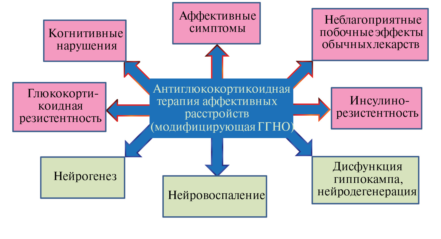 Патофизиология многих аффективных расстройств тесно связана с аномальной реакцией на стресс в результате дисфункции гипоталамо-гипофизарно-надпочечниковой оси (ГГНО) и избыточным выбросом кортизола. Гиппокамп, ключевая структура лимбической системы, отвечающая как за когнитивную, так и за эмоциональную сферы, избирательно уязвим к избытку глюкокортикоидов (ГК), вызывающих нейровоспаление и нейродегенерацию. АнтиГК терапия психических заболеваний, в частности, депрессивных расстройств, может стать полезным дополнительным методом лечения. Среди прочих подходов весьма перспективным считается воздействие на глюкокортикоидные рецепторы, плотность которых высока в гиппокампе. Однако несмотря на то, что доклинические данные достаточно убедительно подтверждают концепцию антиГК терапии заболеваний, ассоциированных со стрессом, клинические исследования все еще находятся на стадии доказательства концепции. Примечательно, что хронический избыток ГК ассоциируется не только с аффективными заболеваниями, но и со снижением когнитивных способностей, метаболическими нарушениями, диабетом. Потенциально антиГК терапия (модифицирующая ГГНО) может облегчить аффективные симптомы, когнитивные нарушения, глюкокортикоидную и инсулиновую резистентность, а также побочные эффекты обычных лекарств за счет позитивного влияния на гиппокамп, предотвращая его дисфункцию, нейродегенерацию, нейровоспаление и нарушение нейрогенеза. Поскольку ассоциированная со стрессом/избытком ГК, опосредованная нейровоспалением патология лимбической системы и, в частности, гиппокампа является общим признаком, характерным для многих заболеваний мозга, концепция антиГК терапии может быть развита, проверена и подтверждена на широком спектре церебральных патологий.