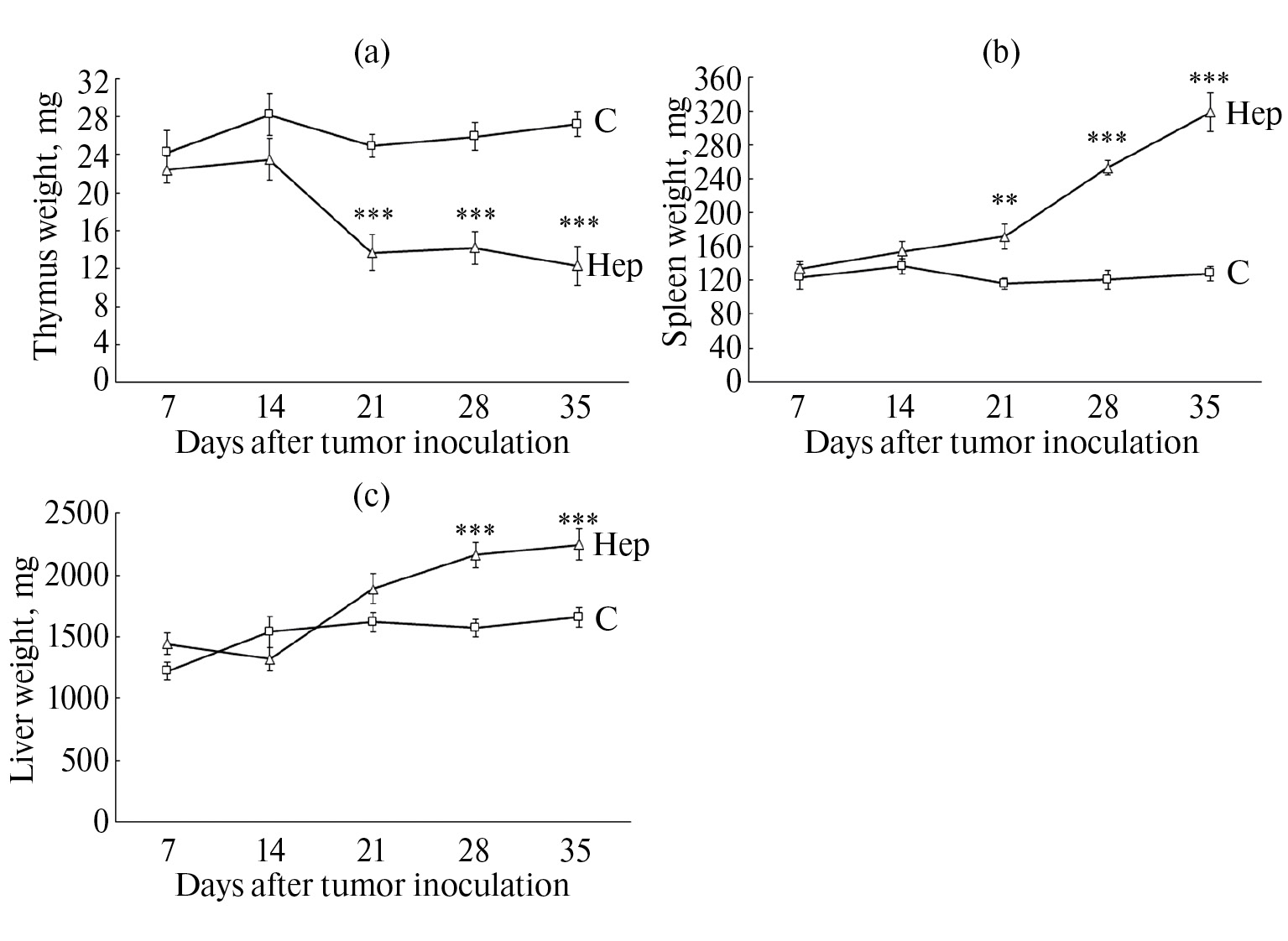 По оси ординат: масса органов, мг, (а) – тимуса, (b) – селезенки и (с) – печени (n = 15–20). По оси абсцисс: дни после инокуляции опухоли, сутки Обозначения: C (Control) – контрольные животные, Hep (Hepatoma 22a) – мыши с гепатомой 22а. Здесь и далее данные представлены в виде средней величины и ошибки среднего (M ± m), звездочками обозначены достоверные различия между опухолевой (Hep) и контрольной (С) группами животных: * – р < 0.05, ** – р < 0.01, *** – р < 0.001.