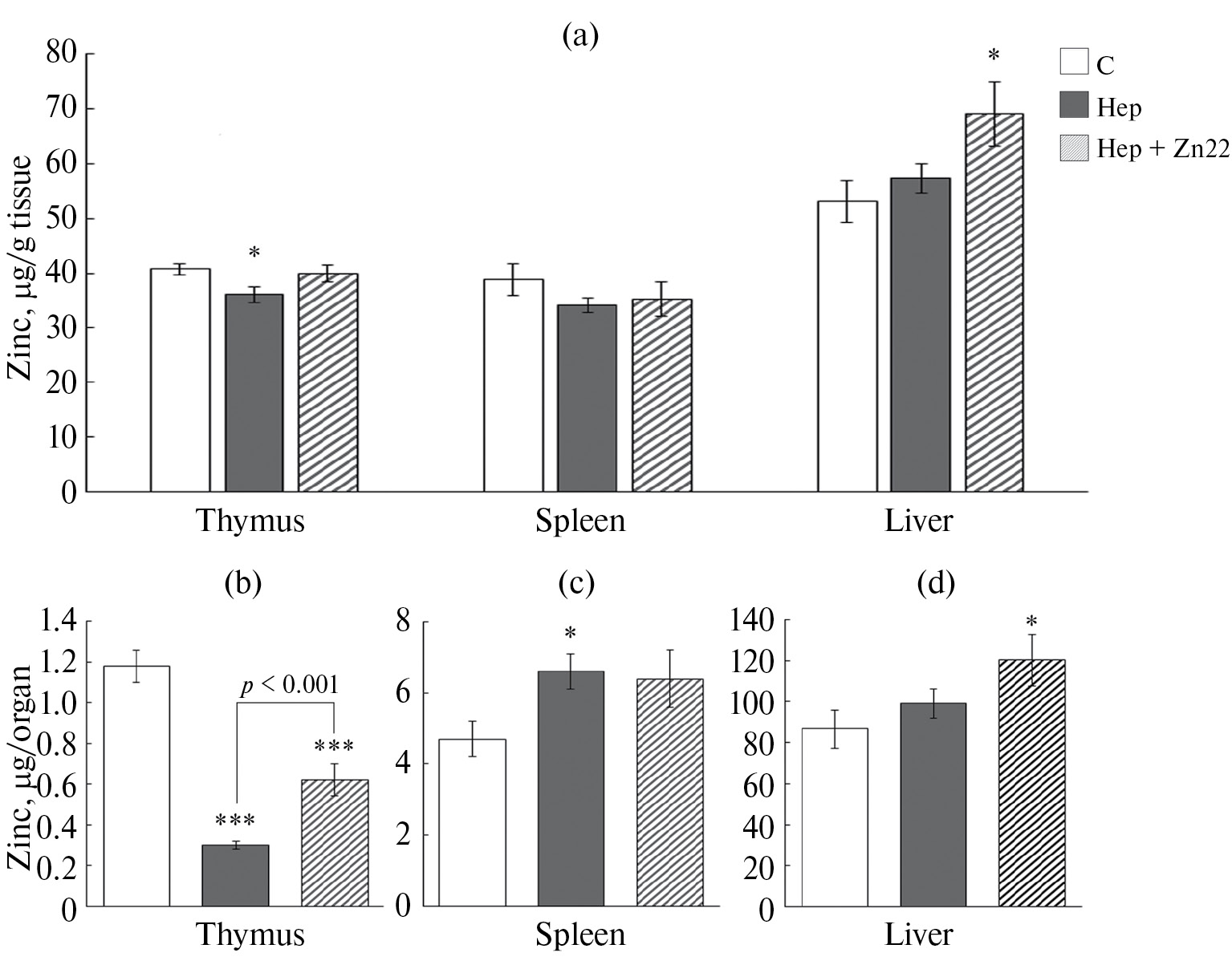 Рис. 2. Влияние опухолевого роста и приема сульфата цинка в течение 21 суток на содержание эндогенного цинка в органах. По оси ординат: (а) содержание цинка в расчете на единицу массы, µg/g сырой ткани, (b, c, d) содержание цинка в расчете на весь орган, µg/organ. В каждой группе по 10 мышей. По оси абсцисс: группы животных. Обозначения: С (Control) – контрольные животные, Hep (Hepatoma) – мыши с гепатомой 22а, Hep+Zn22 – мыши с гепатомой 22а, получавшие сульфат цинка (22 мкг/мл с питьевой водой). Звездочками обозначены достоверные различия каждой из опытных групп по отношению к группе (С) контрольных животных.
