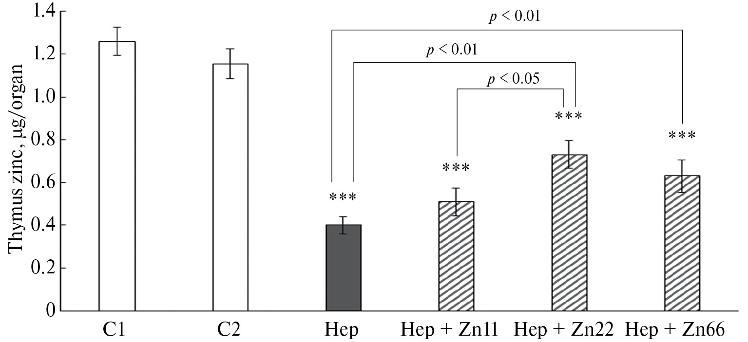 Рис. 3. Влияние разных концентраций сульфата цинка в питьевой воде на содержание эндогенного цинка в тимусе. По оси ординат: содержание эндогенного цинка в тимусе в расчете на орган, µg/organ. По оси абсцисс: группы животных C1 (Control1) – группа контрольных животных; C2 (Control2) – группа контрольных животных, получавших сульфат цинка в концентрации 22 мкг/мл в течение 21 суток; Hep (Hepatoma) – животные в гепатомой 22а; Hep+Zn11, Hep+Zn22, Hep+Zn66 – животные с гепатомой 22а, которые получали в течение 21 суток сульфат цинка в концентрациях 11, 22 и 66 мкг/мл соответственно. В каждой группе по 10 мышей. Звездочками обозначены достоверные различия между каждой из опытных групп по отношению к контрольной (С1) группе животных.