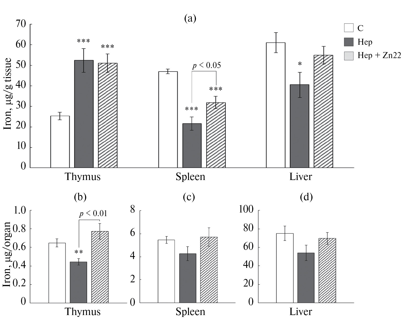 В результате приема сульфата цинка у животных наблюдалось повышение содержания железа в селезенке и печени при расчете обоими способами (рис. 4a, c, d), а в тимусе только при расчете на весь орган (рис. 4b). При этом содержание негемового железа при расчете на орган восстанавливалось полностью до нормальных показателей в тимусе, печени и селезенке. Удельное содержание негемового железа в тимусе (при расчете на единицу массы) после приема цинка не изменялось и оставалось таким же повышенным, как и в группе мышей с гепатомой 22а, которые цинка не получали (рис. 4b).