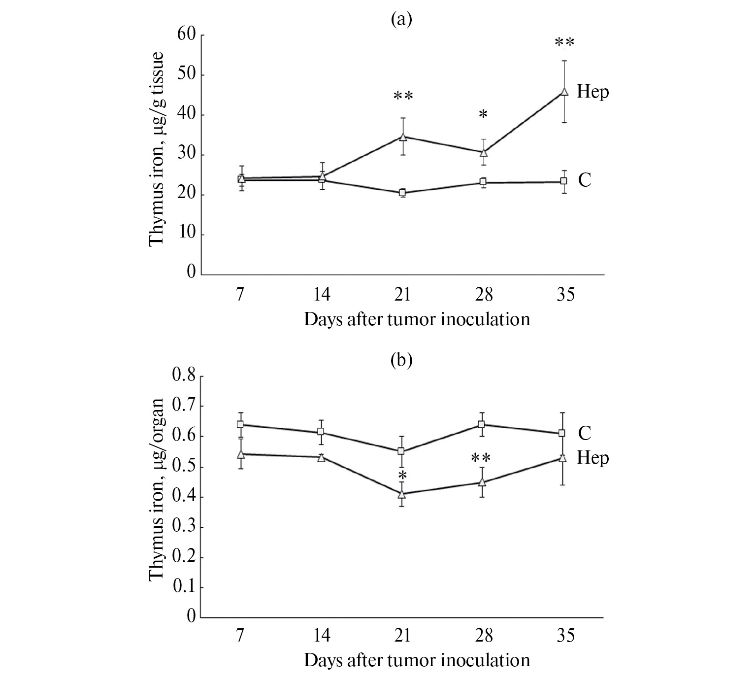 Рис. 5. Влияние опухолевого роста на содержание негемового железа в тимусе. По оси ординат: (а) содержание железа в тимусе, µg/g сырой ткани; (b) содержание железа в тимусе в расчете на орган, µg/organ, C – у контрольных мышей и Hep – у мышей с гепатомой 22а. В каждой группе 15–20 мышей. По оси абсцисс: время после инокуляции гепатомы 22а, сутки.